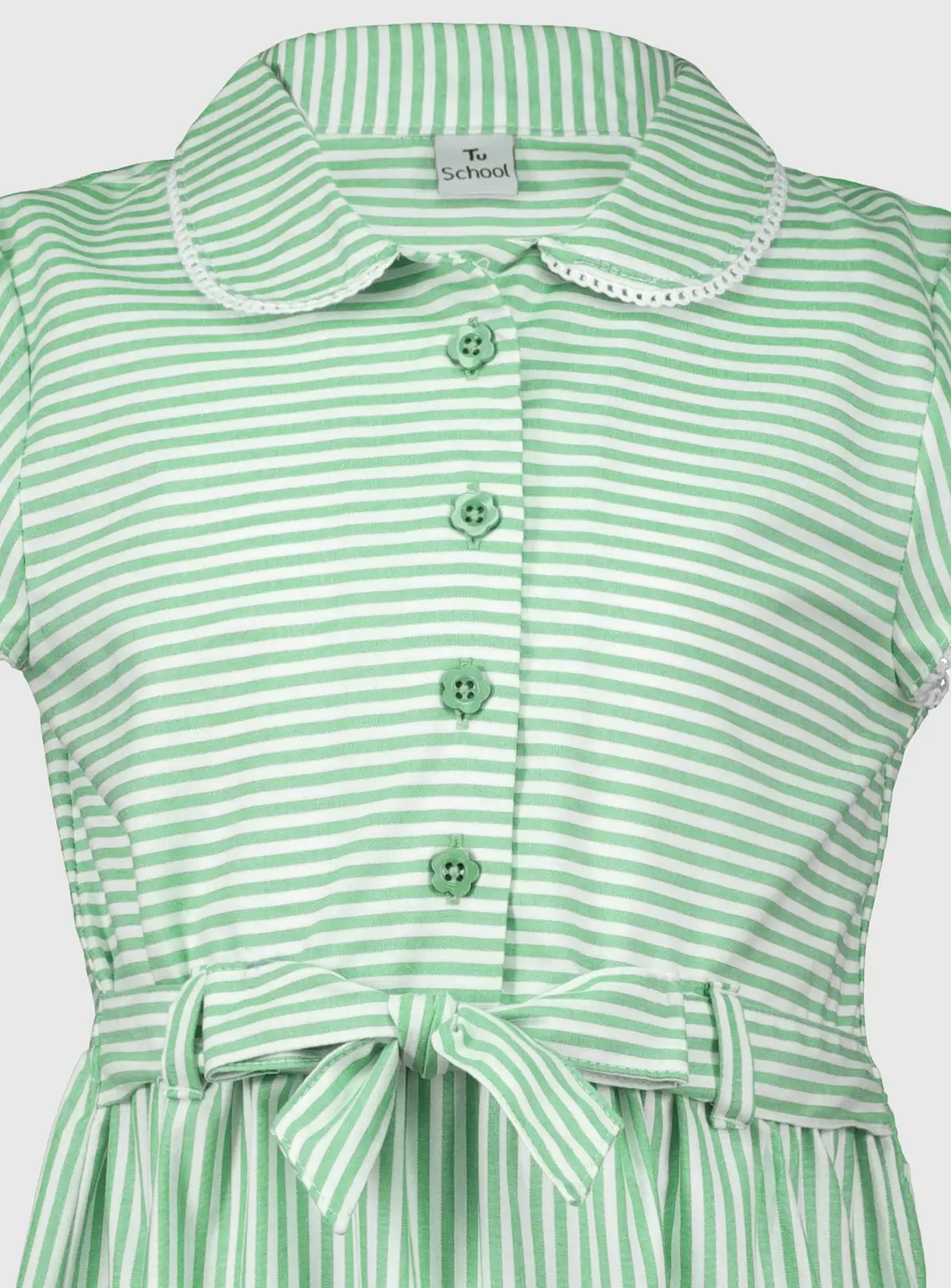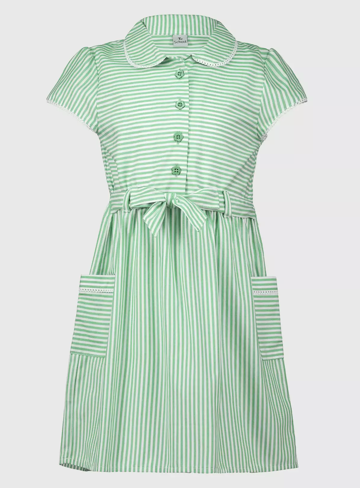 Coated with Teflon EcoElite for extra stain resistance, our easy iron, cotton rich stripe dress will keep its looks no matter what school ground japes your kids put it through. With a gathered skirt, a bow tie-belt to the front and a pretty scalloped edged collar, they are perfect for everyday school wear on warmer days. Available in other colours.