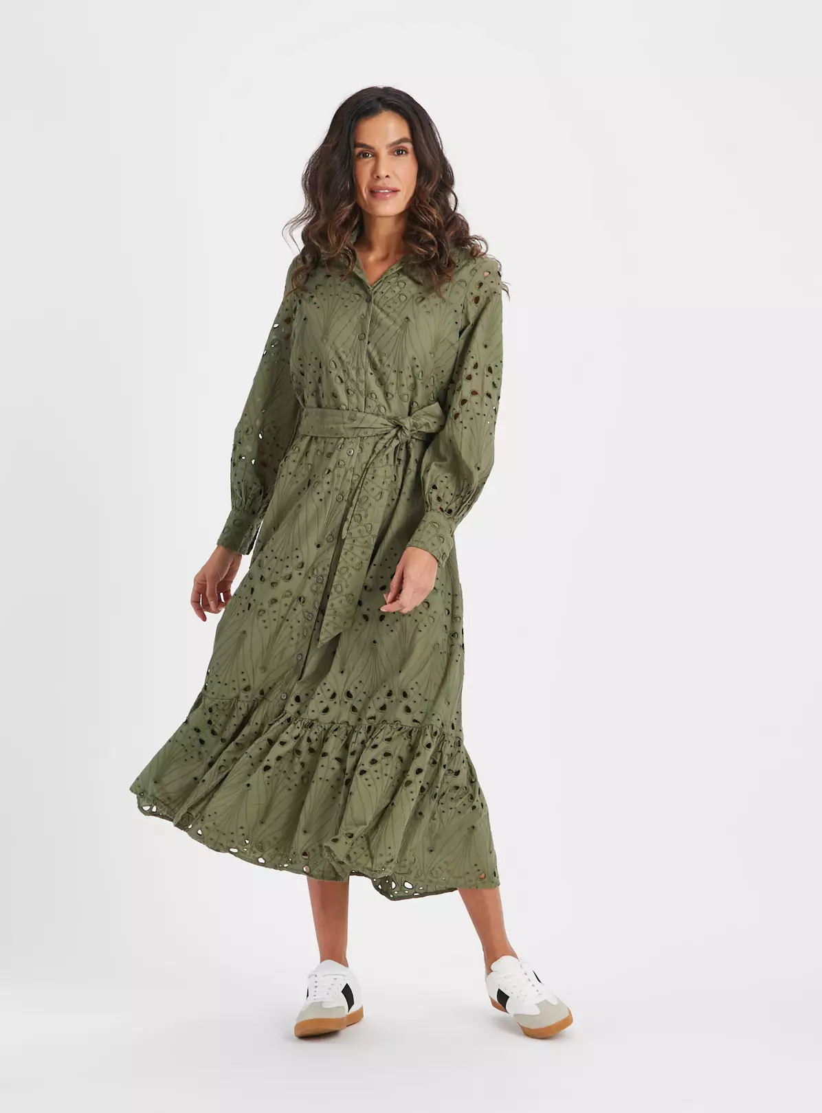 In a gorgeous broderie fabric, our cute shirt dress is perfect for spring. Featuring a tie belt to cinch in your waist and long sleeves, it’s crafted from pure cotton. Pair with white trainers to complete the look.
