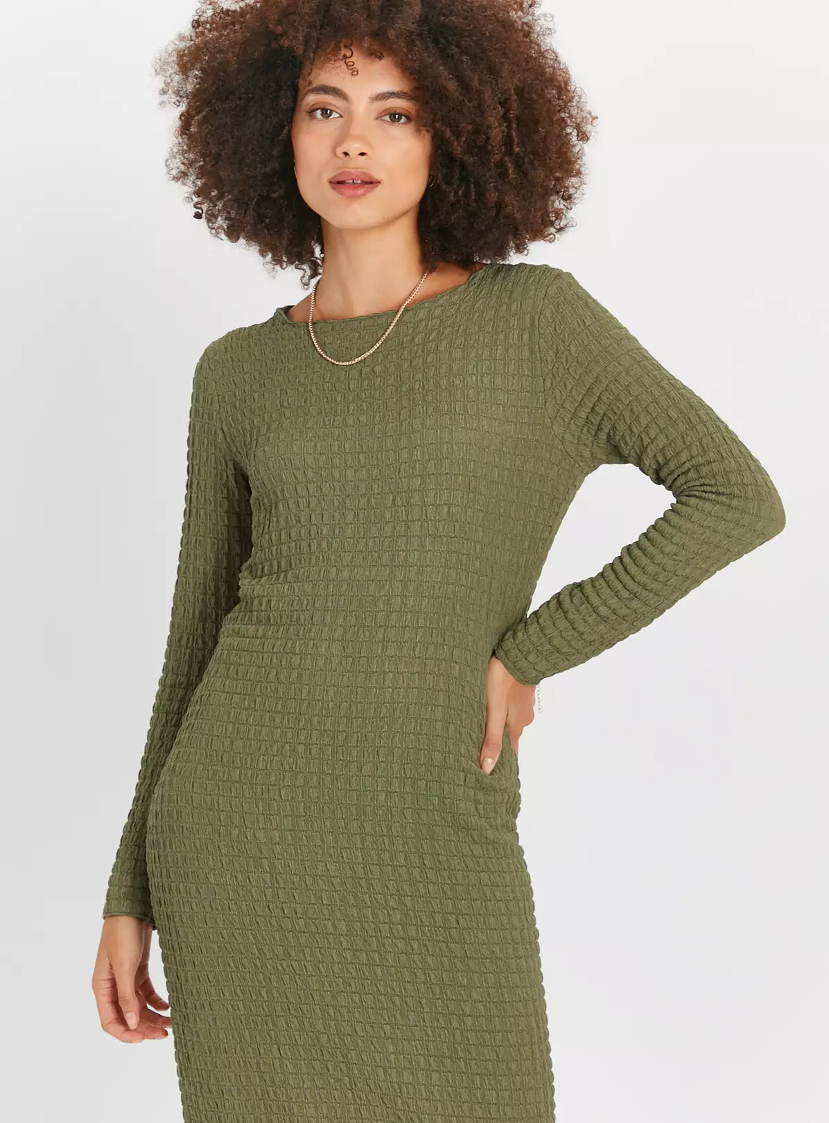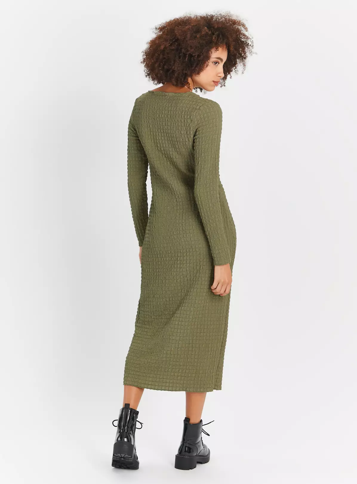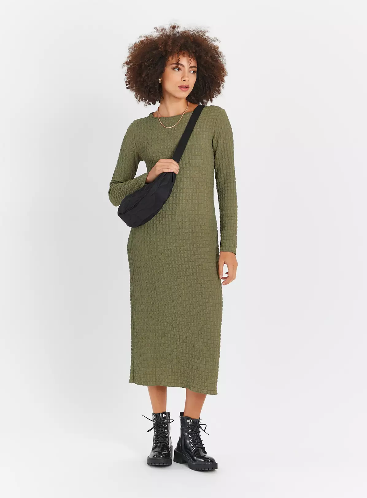 Elevated by a stunning bubble textured design, our long sleeve dress is a staple for your collection! It comes in a gorgeous khaki shade and has a midaxi length for a flattering look. Team it with a pair of black ankle boots for a chic weekend outfit.