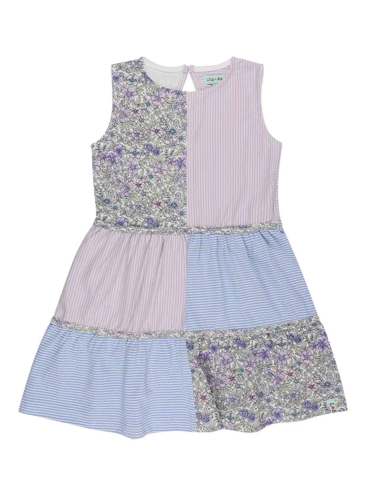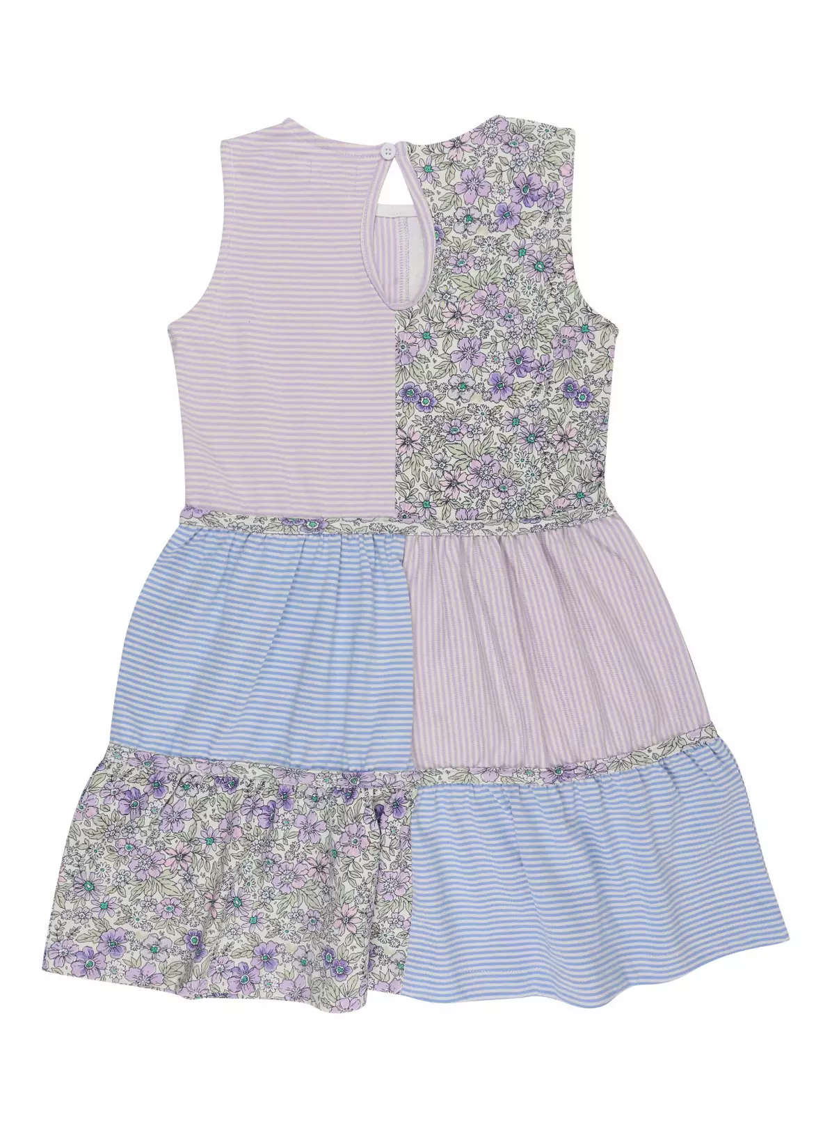 Perfect for your little dancers, our sleeveless tiered a-line dress features our blooming cute floral print and our lilac & blue stripe print. Made from our 100% GOTS organic cotton fabric, our patchwork dress is super-soft, breathable and ready for any adventure.