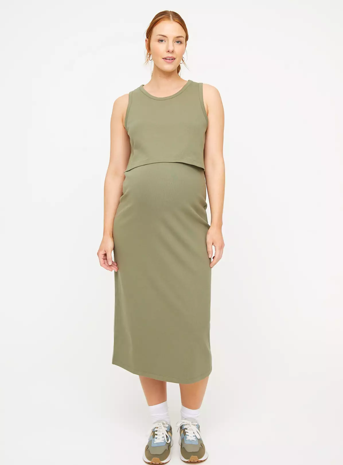 Fresh from our latest Maternity edit, our midi dress is elevated by a cool khaki shade. In a sleeveless style, it comes in a ribbed fabric designed to offer you maximum comfort throughout your day. It features access holes on top, perfect for nursing and hassle-free feeds.