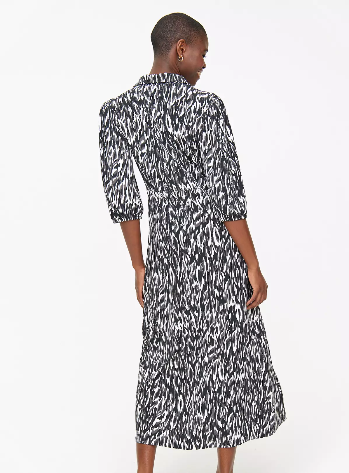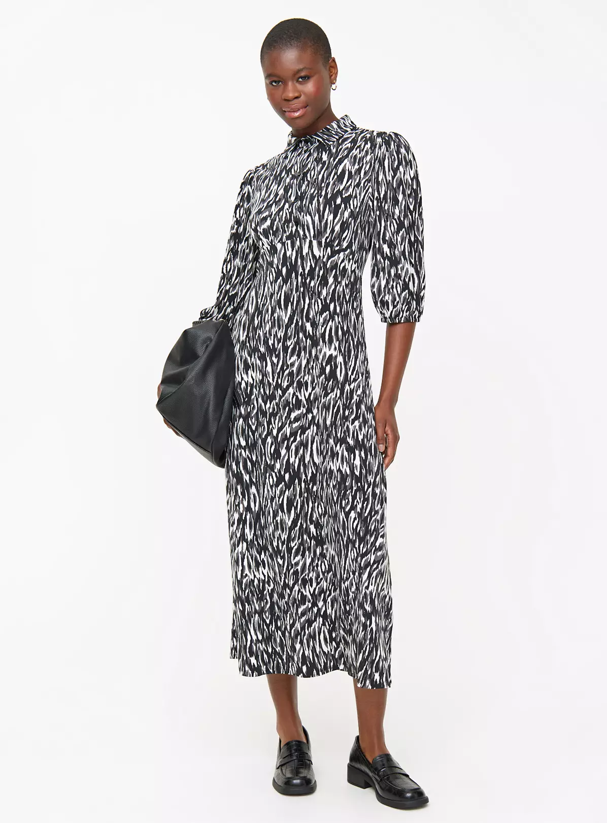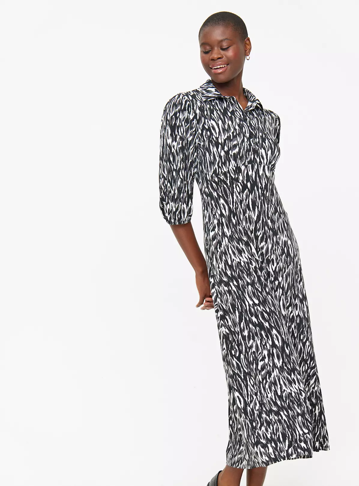 In a statement monochrome print, our shirt dress is a favourite from our latest collection! Featuring a flattering midaxi length, it also has elasticated cuffs and value fastening on the front. Style it with sandals or court heels.