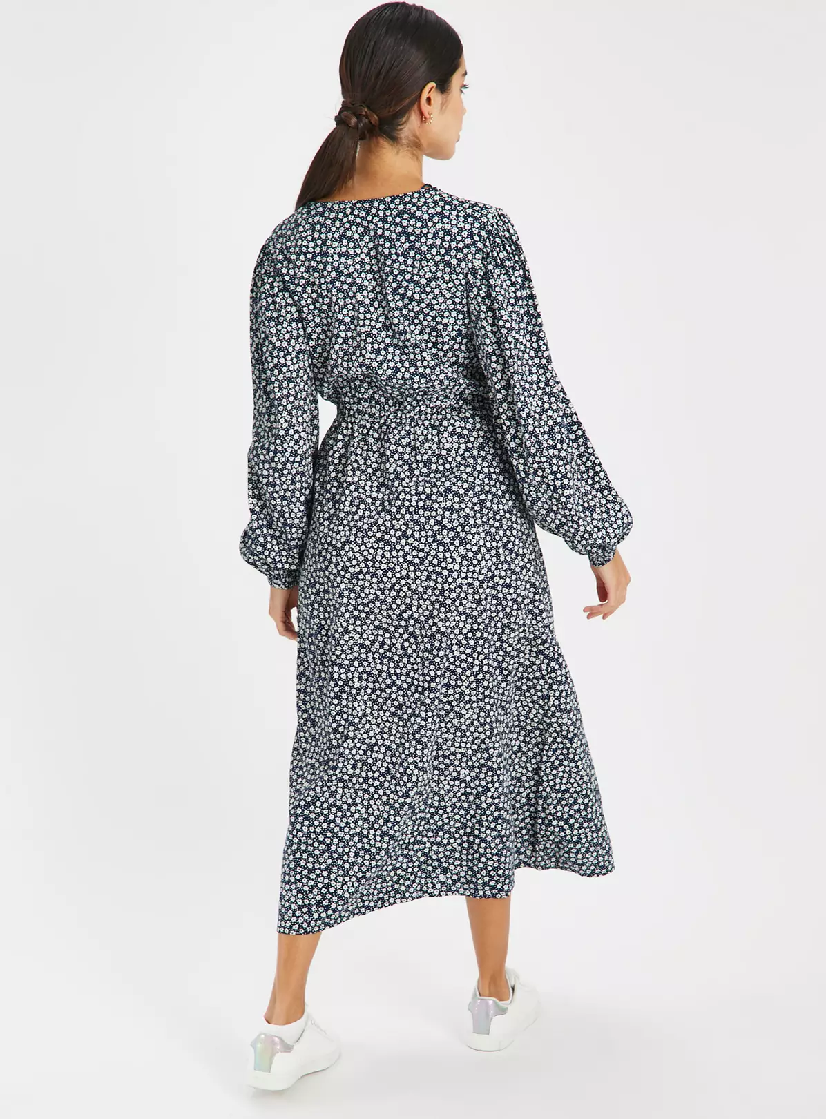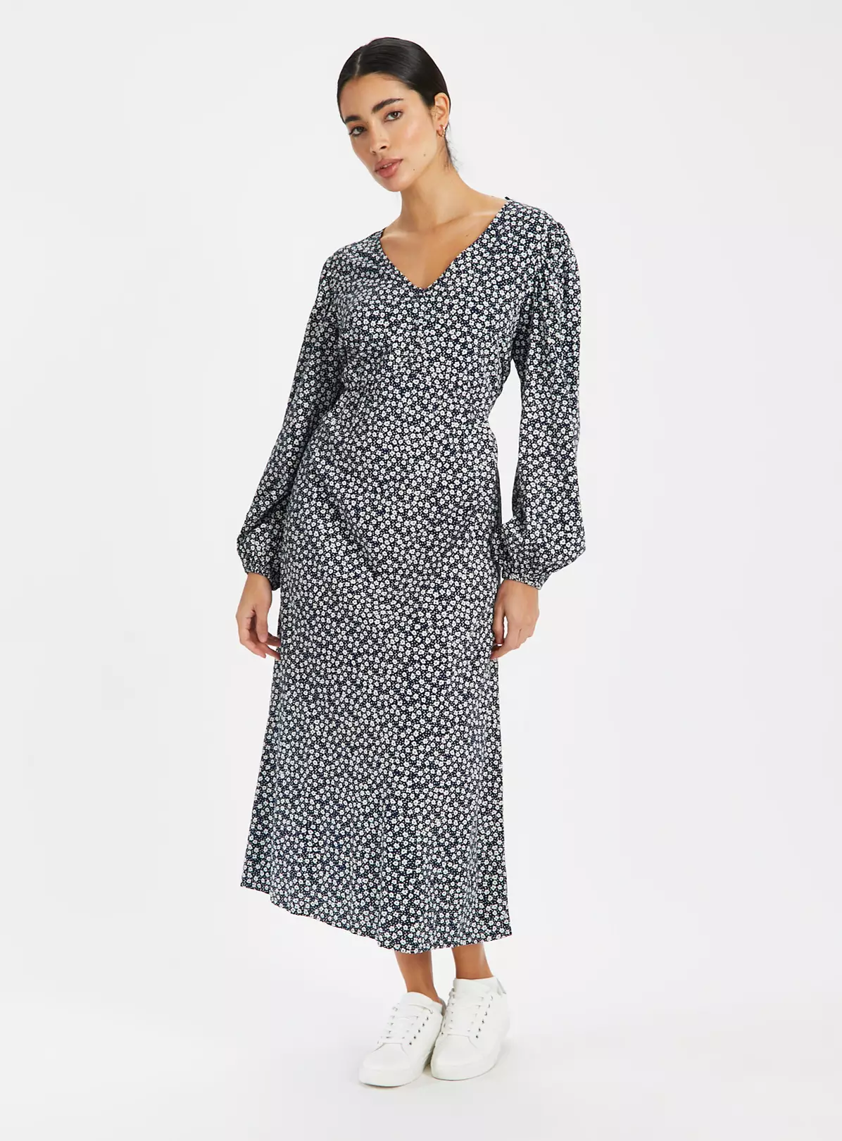 A stunning staple for your evening’s out and special occasions, our navy tea dress comes in a floral design. It features flattering volume sleeves and comes in a midi length. For a current and chic look, team it with a pair of white trainers.