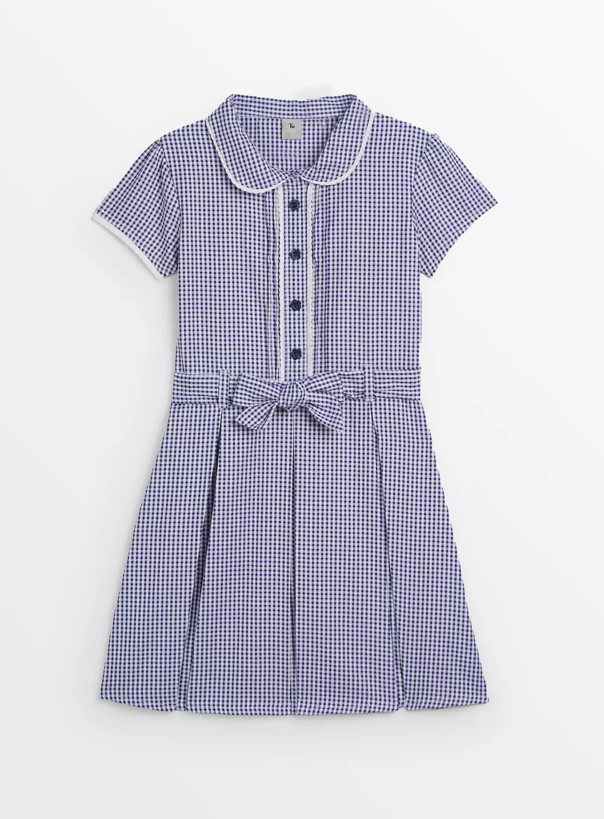 Coated with Teflon EcoElite for extra stain resistance, our easy iron, cotton rich navy gingham dress will keep its looks no matter hard they work and play. With a box pleated skirt, a pretty tie bow at the front and a lace trim, it’s perfect for everyday school wear on warmer days. And with the dress with ease one touch fastening to the waist, they’ll be ready in a flash. Available in several colours.