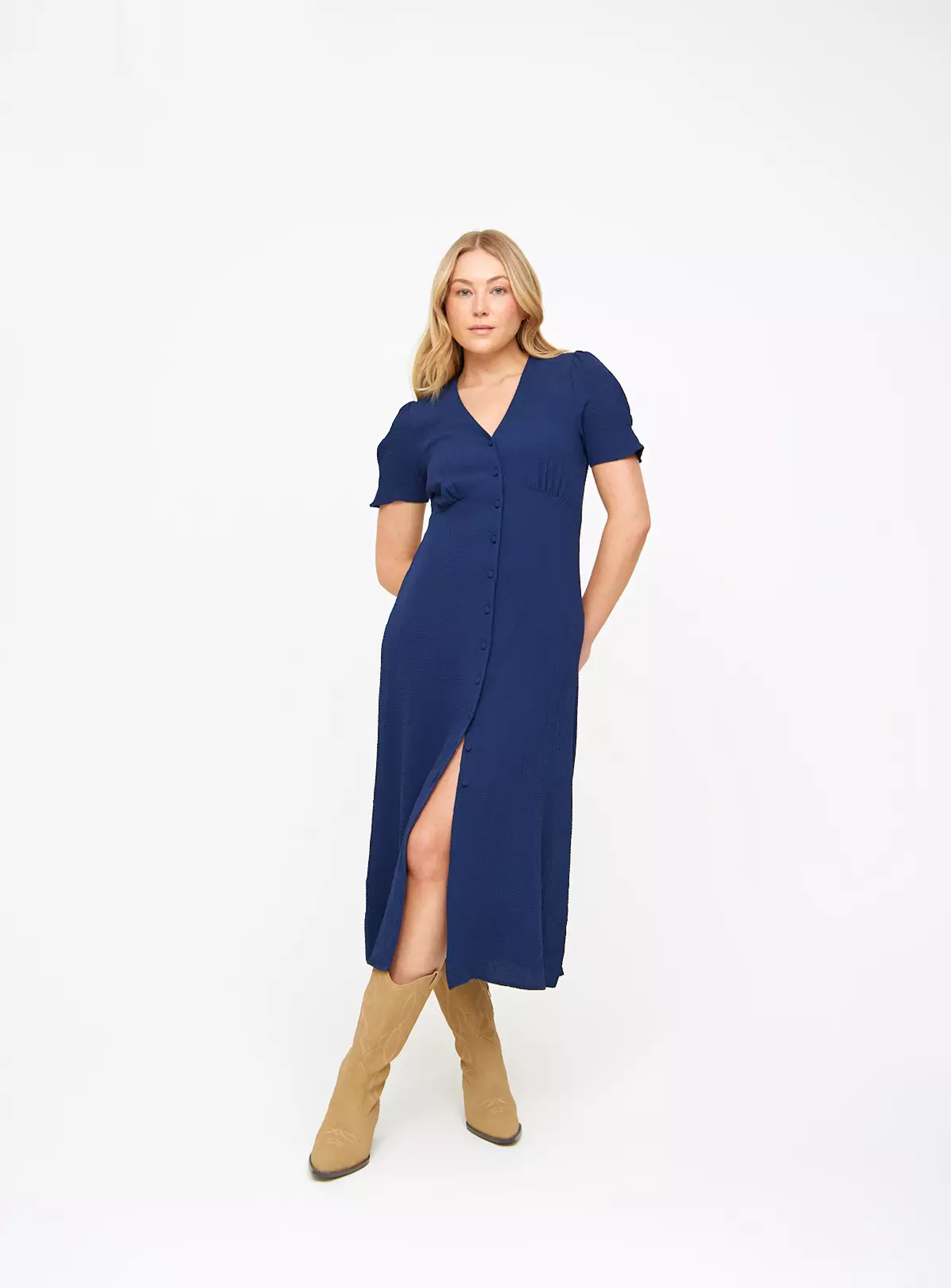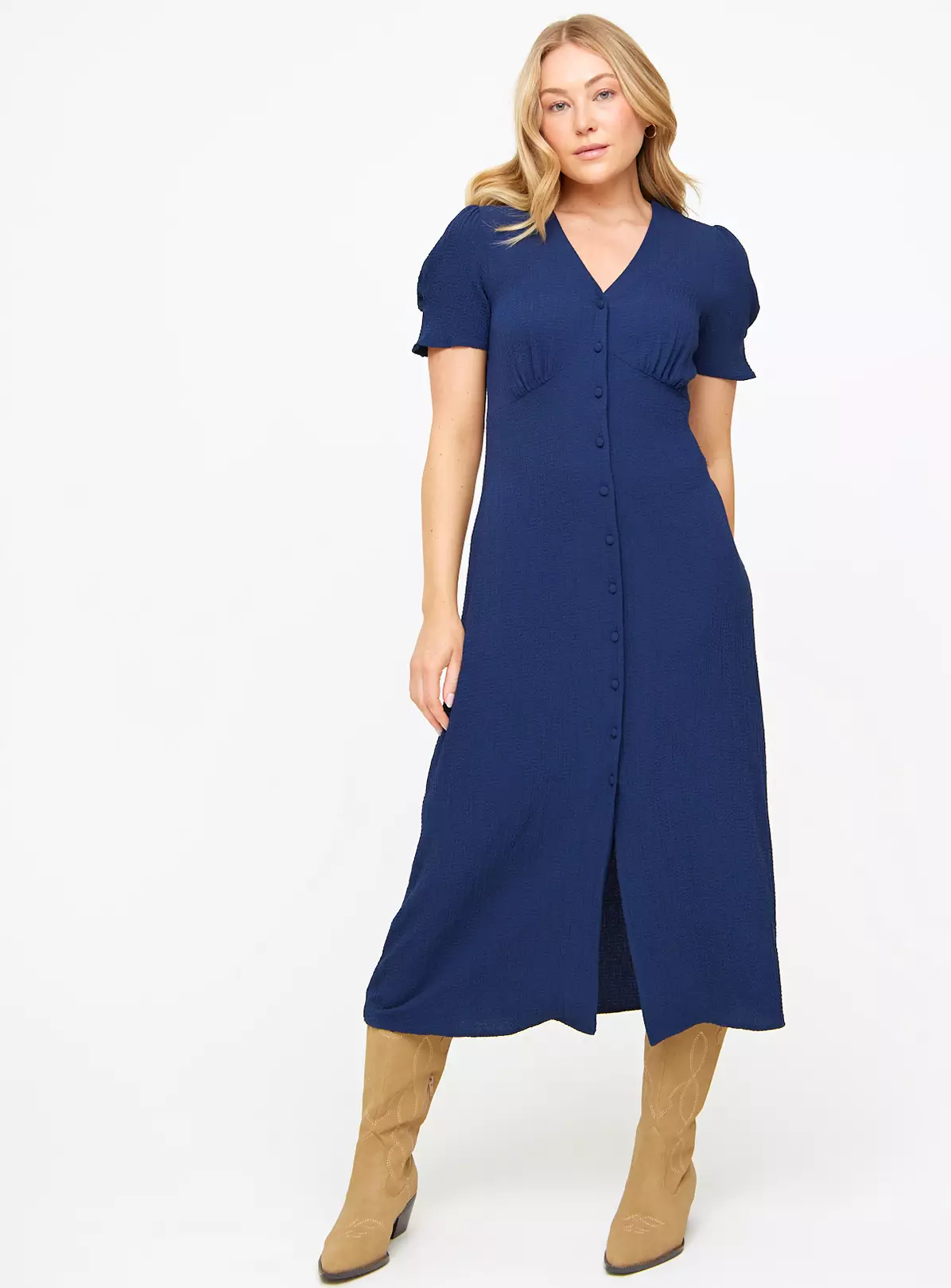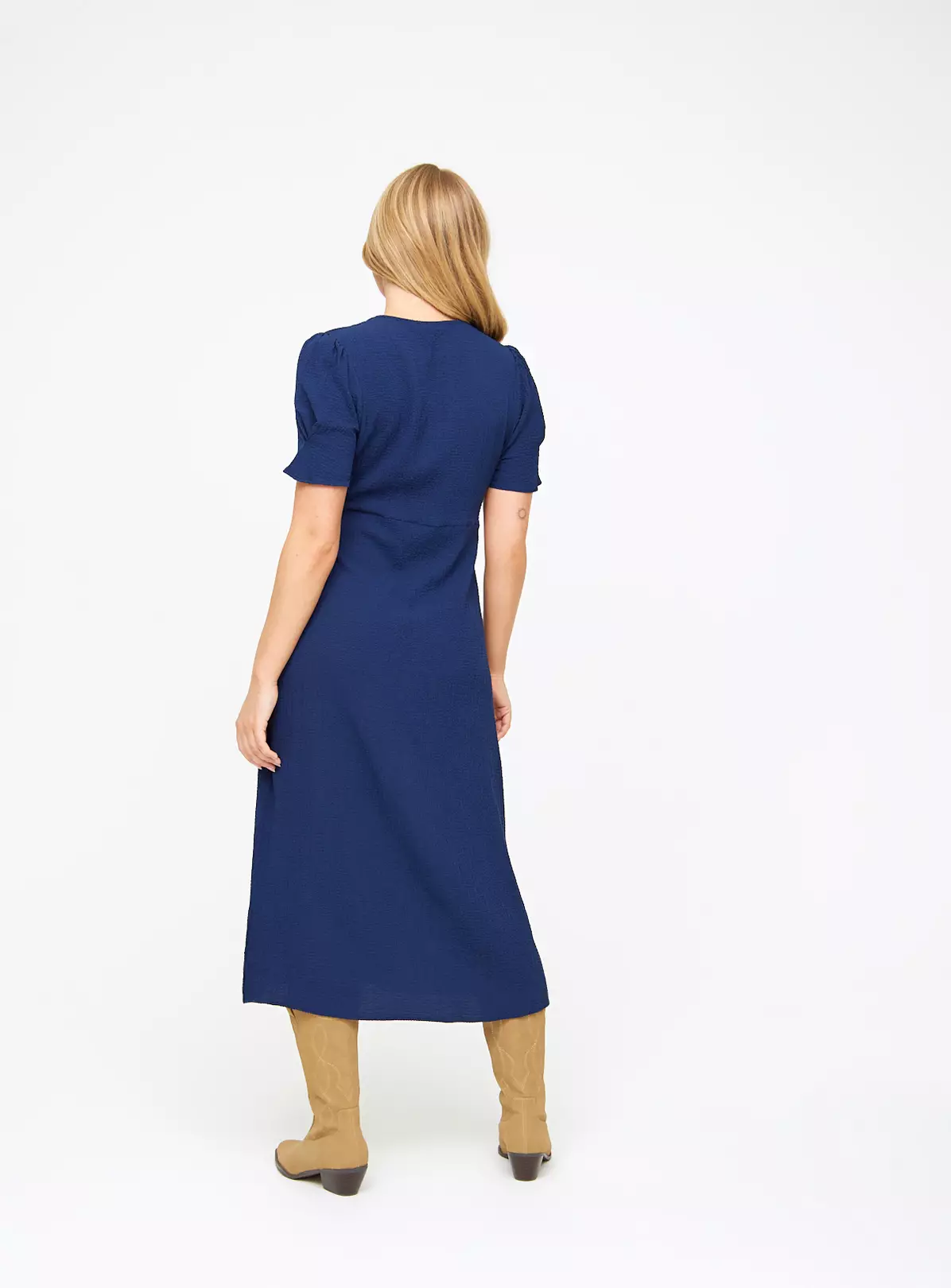 Elevate your look with our navy tea dress. In a flattering midi length, it has a textured fabric giving it a modern feel. Featuring value fastening, it also has ruched detailing on the sleeves. Style it with beige cowboy boots for a fun look.
