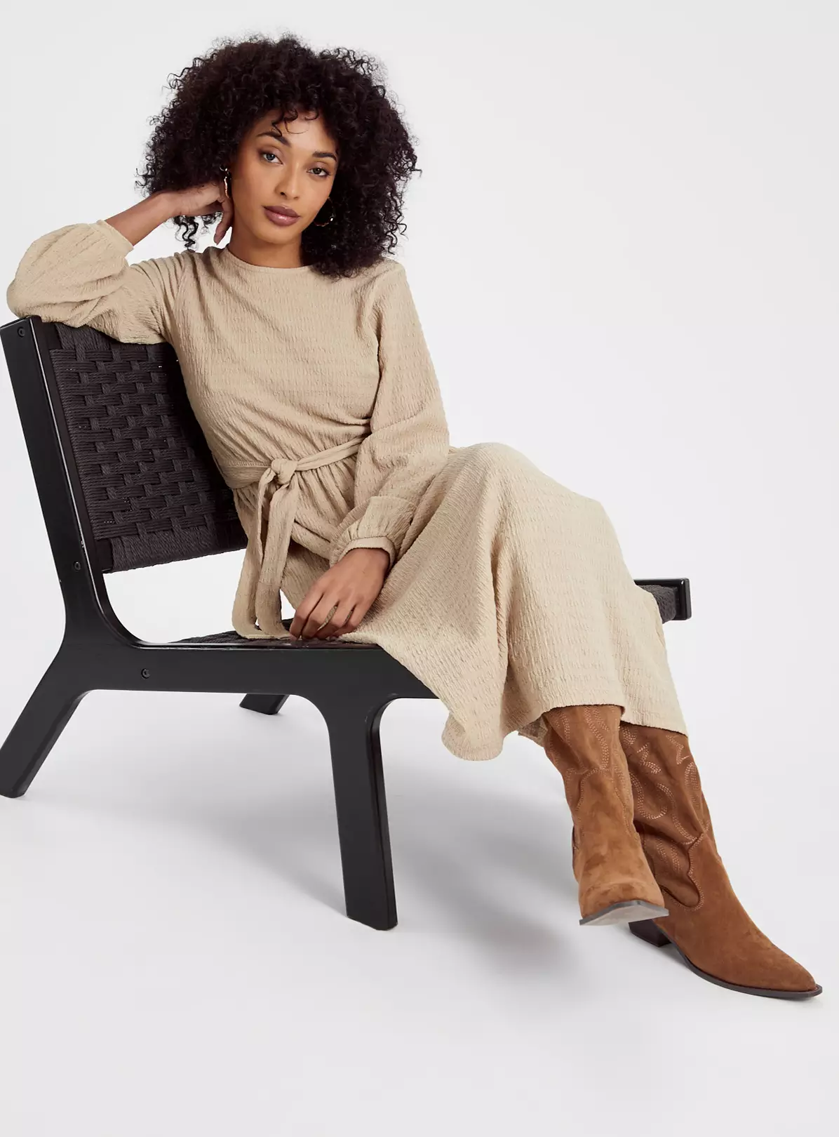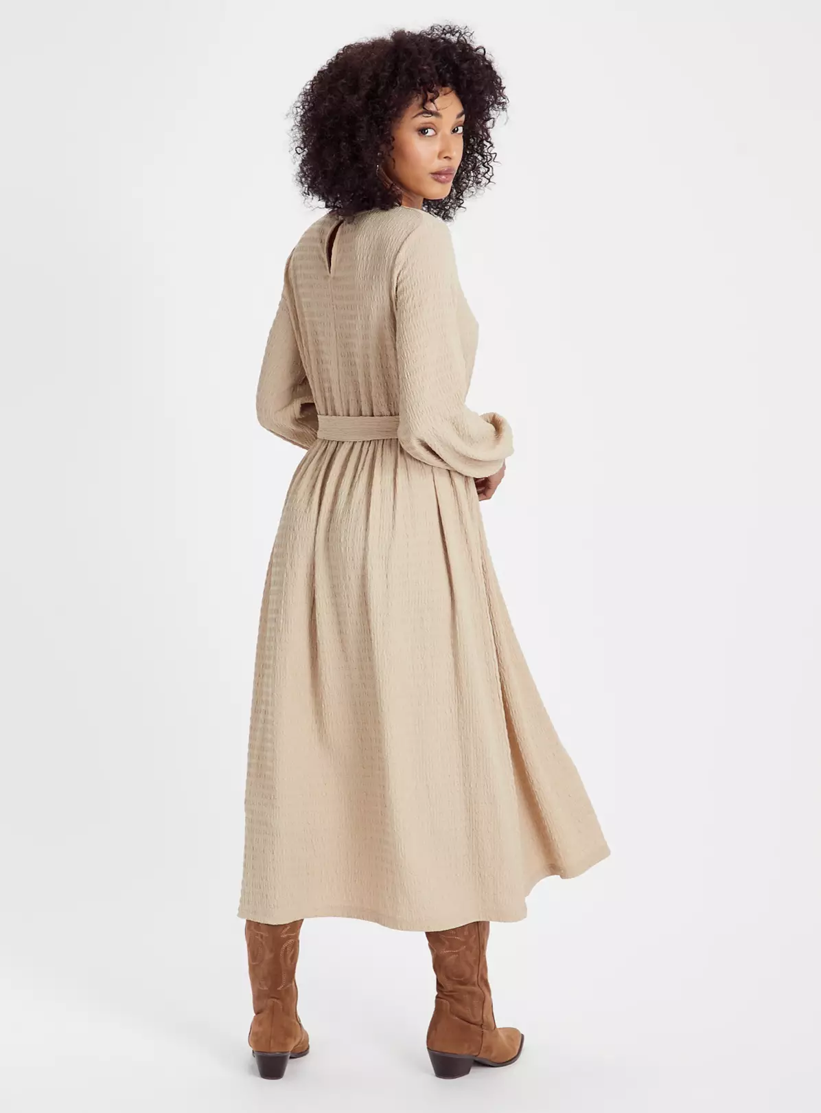 This season we’re loving neutral tones! Our crinkle midi dress is a staple for evenings out and weekend wear. It features a tie waist designed to accentuate your figure and comes in a flattering midi fit. Style it with brown boots for a boho-chic vibe.
