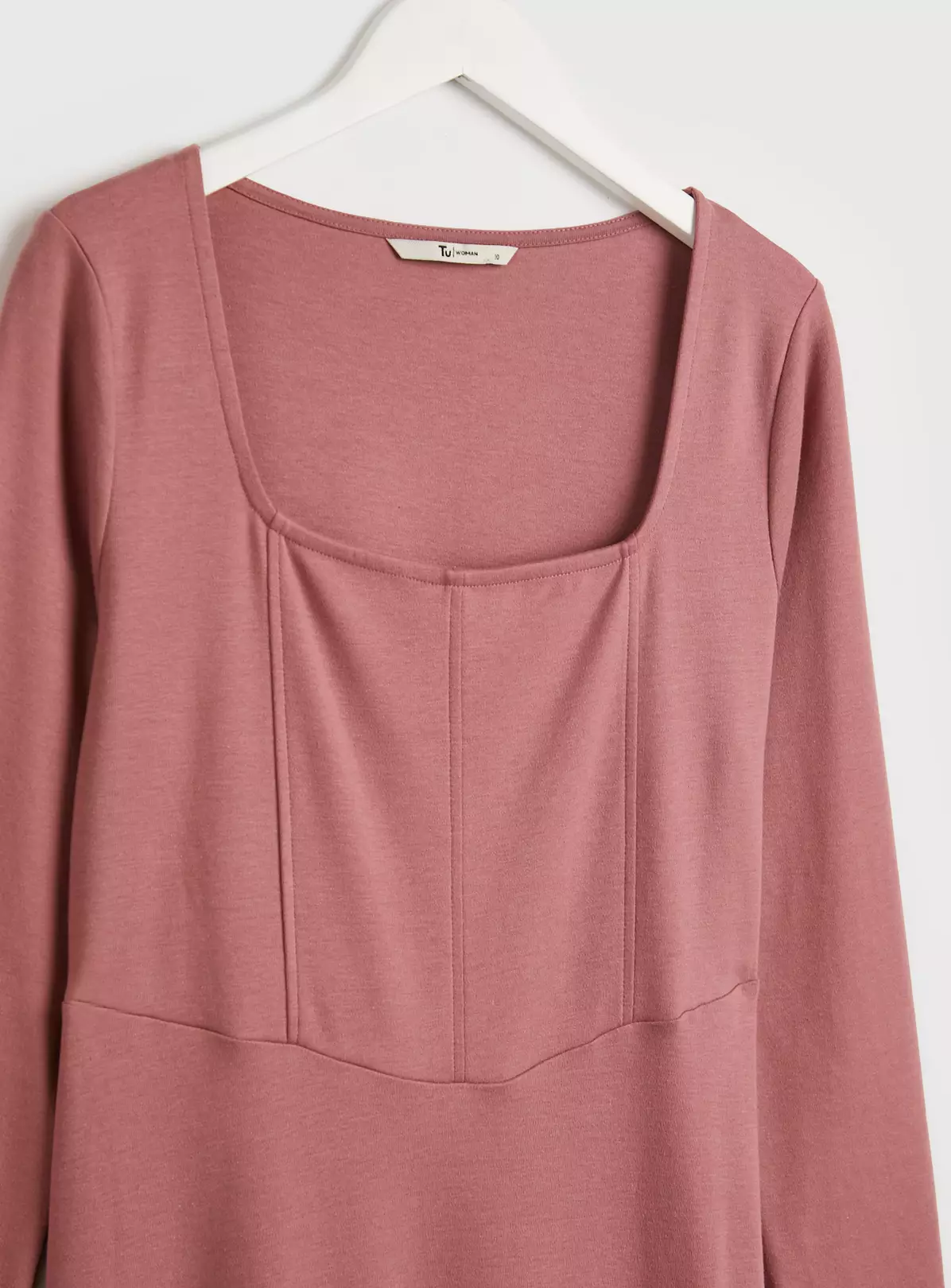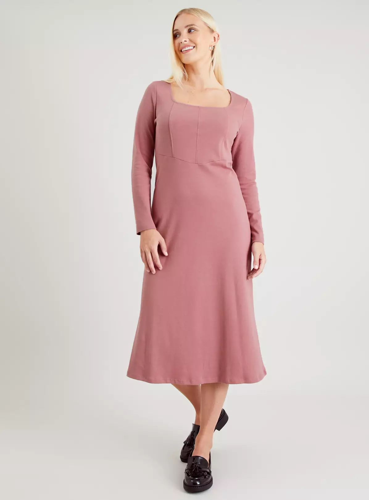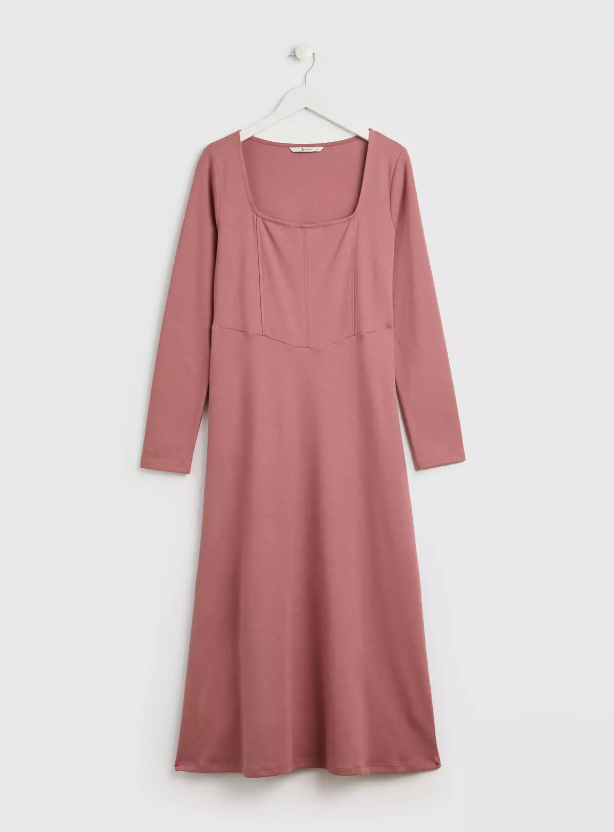 The perfect dress for a throw on and go weekend fit, this dress is the perfect partner for summer sandals. In a flattering dusky pink, it’s midi length with corset style panels and a subtle A line. Just add a girly get together!