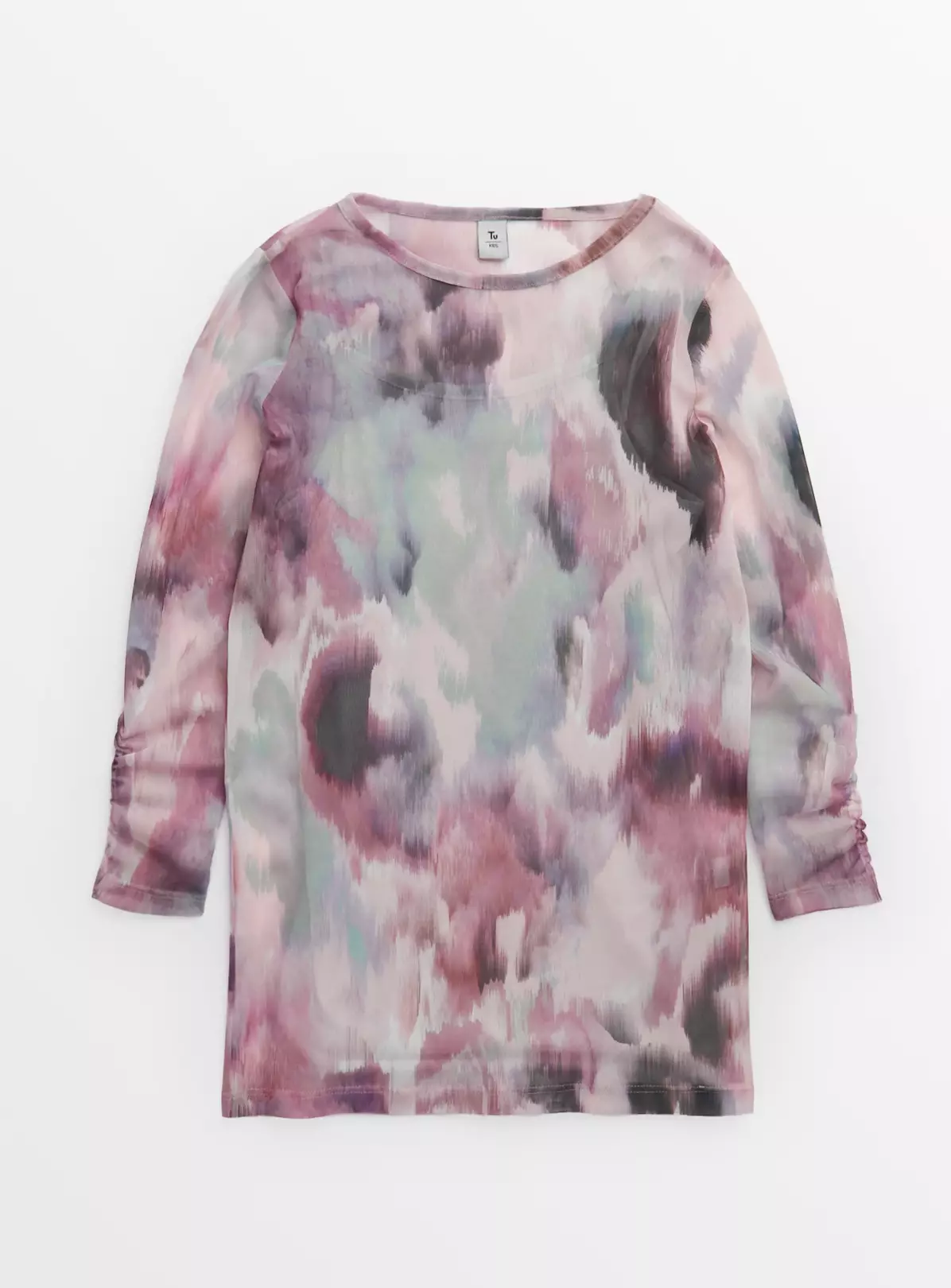 They’ll look super trendy in our new column pink blurred print dress. Designed in a stretchy mesh fabric, it has a round neck and long sleeves. Perfect for spring, pop on a little cardigan on chillier days.