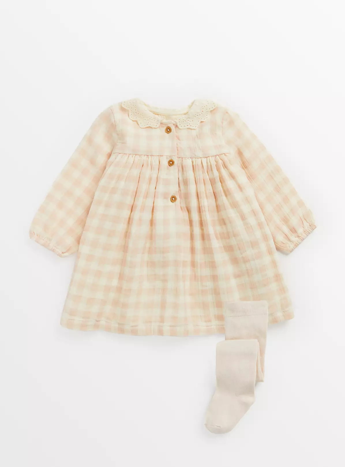 A must-have mini outfit for your little one! Our dress and tights set includes 1 double cloth long sleeve dress which has a lovely ginham print throughout, as well as 1 pair of cream cotton-rich tights to match. Perfect for their weekend wardrobe!