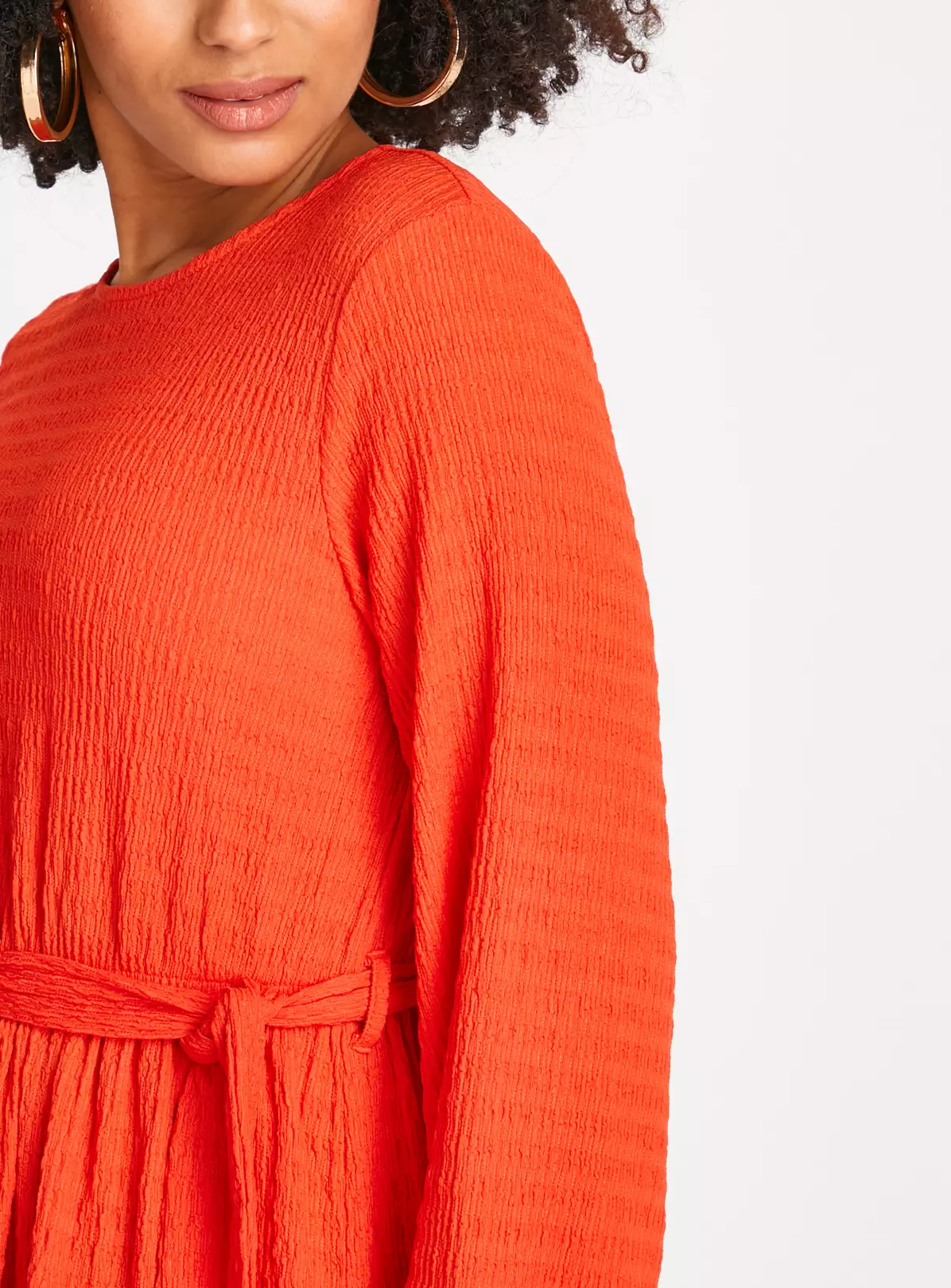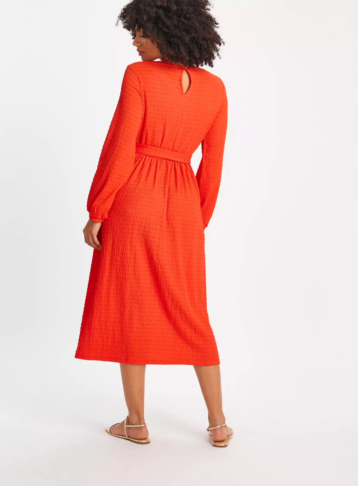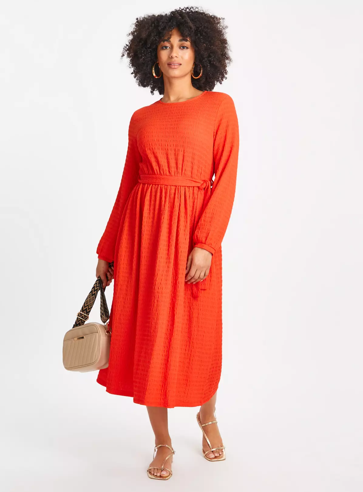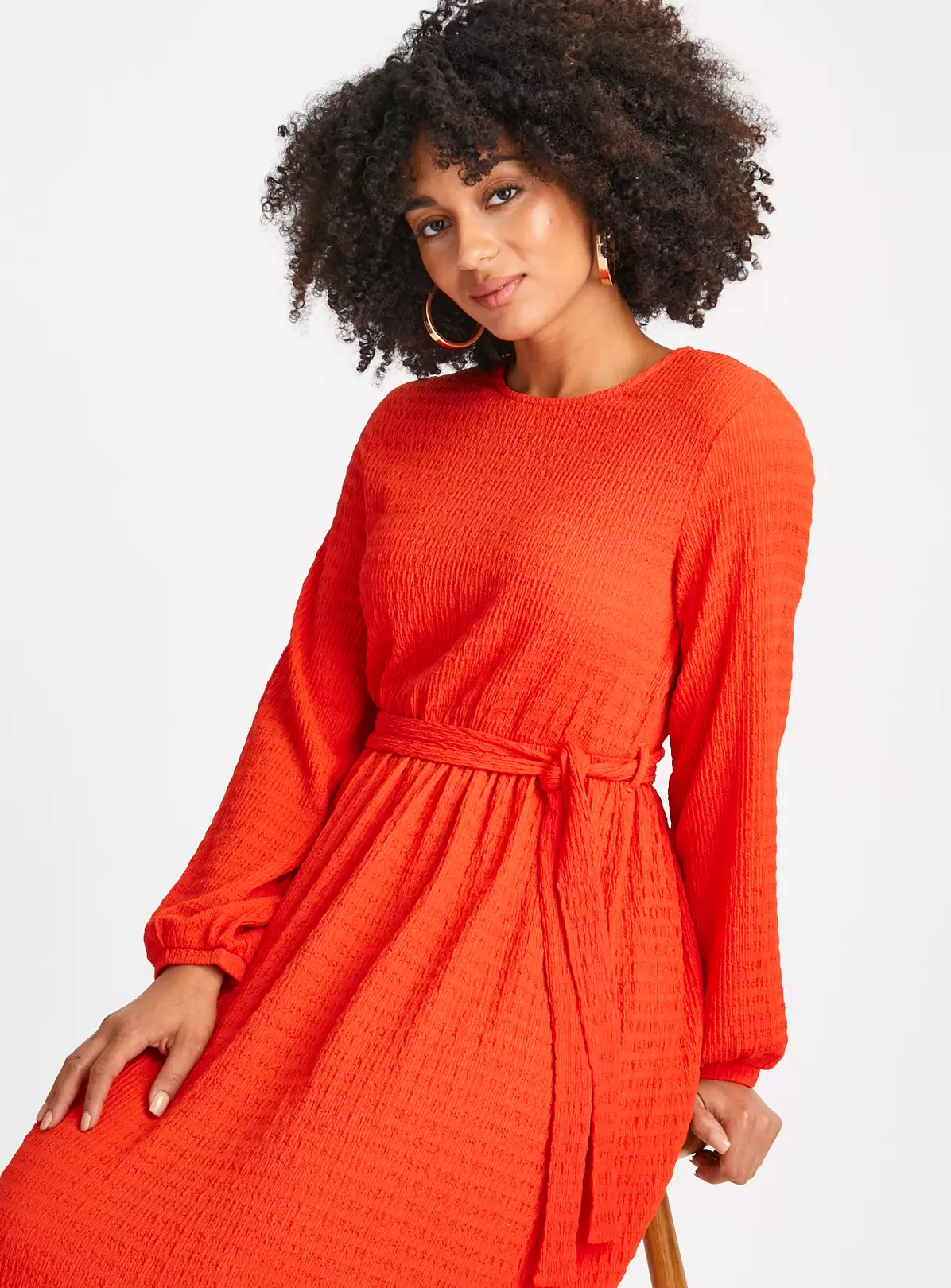 Make a bold statement in our red crinkle dress. In a flattering midi length, it features a tie-waist belt designed to accentuate your figure. Accessorize with a pair of gold hoop earrings and a beige handbag.