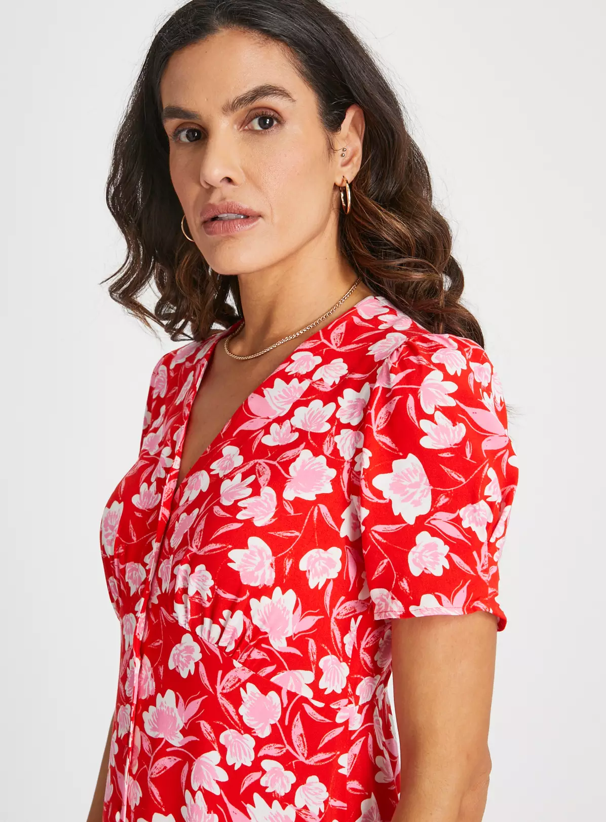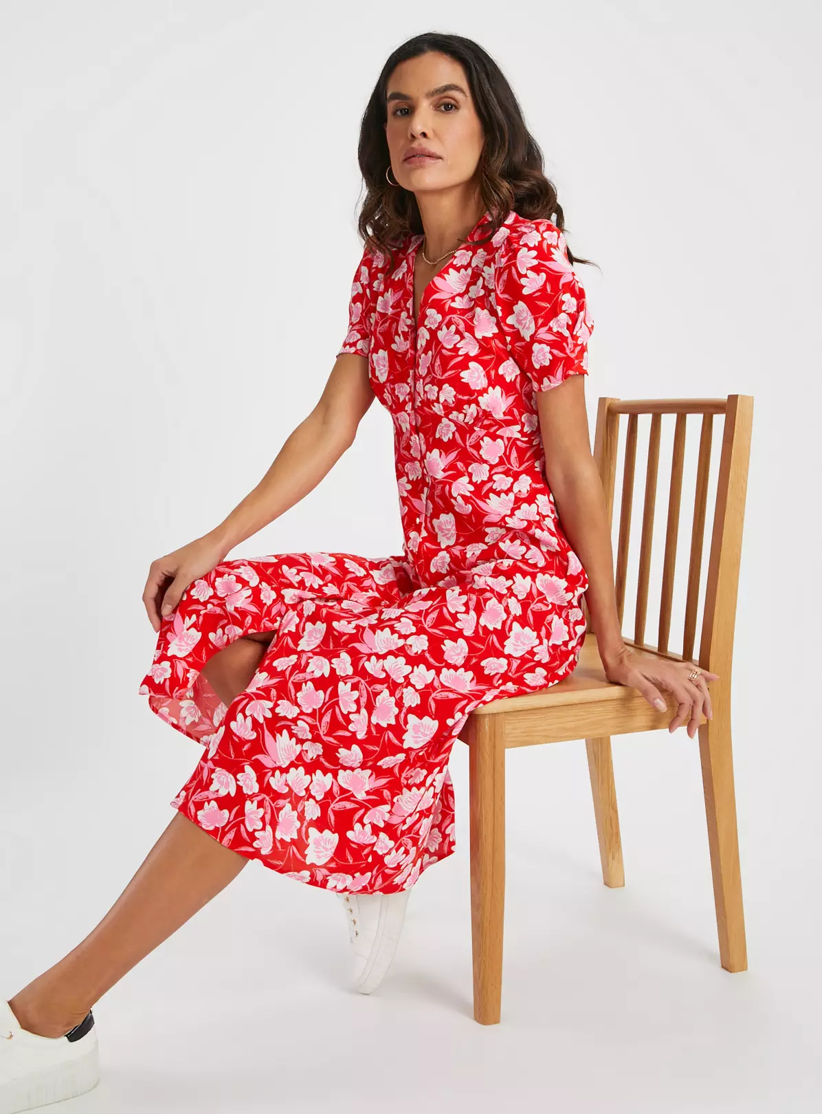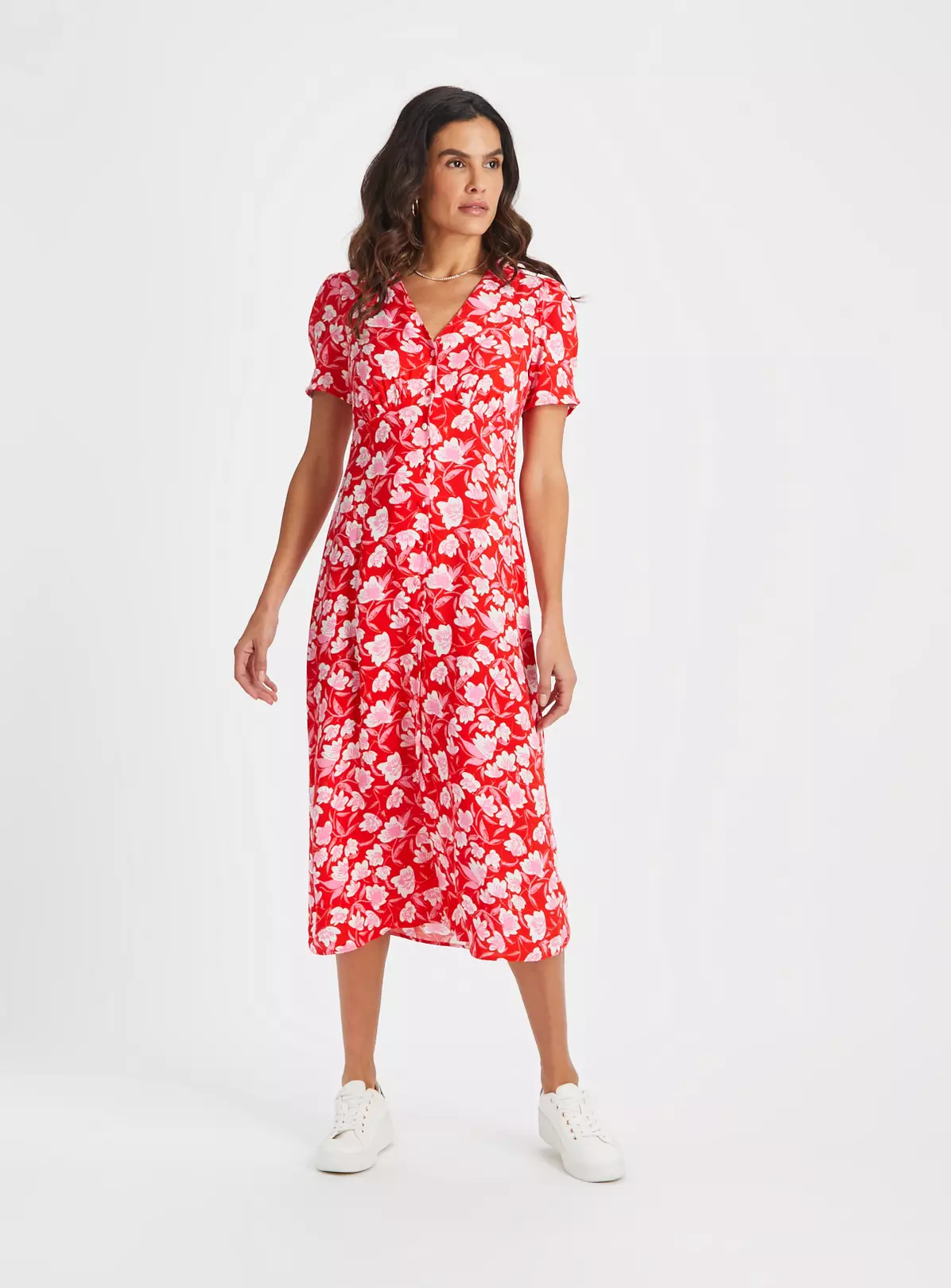 In a gorgeous red with a lovely floral print, our tea dress is perfect for spring. It features a V-neckline, short puff sleeves and value detailing at the front. With a cute floaty skirt, it’s fun and fabulous for a balmy day!