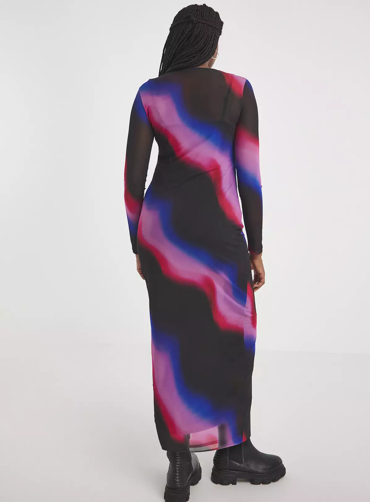 Introducing our Printed Mesh Midaxi Dress. In a delicate mesh fabric, this dress features a colourful blurred print. Wear this on your next night out with heels.