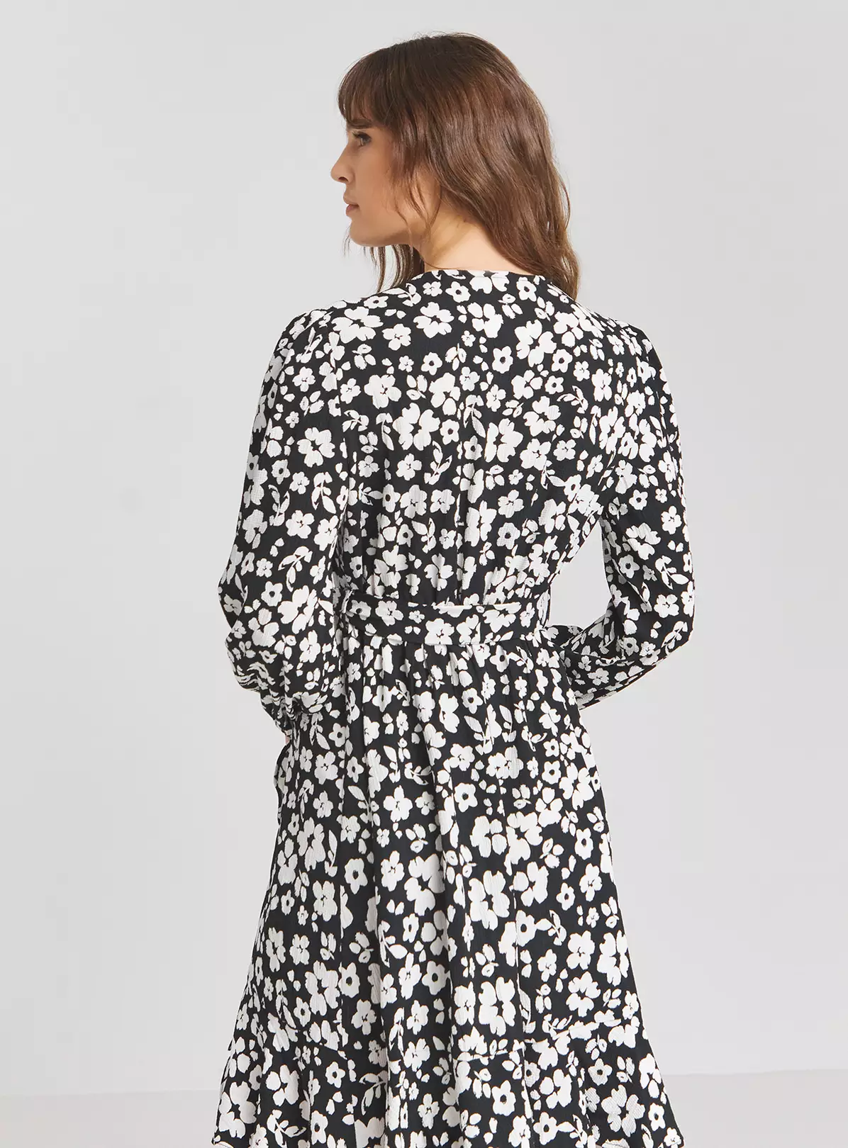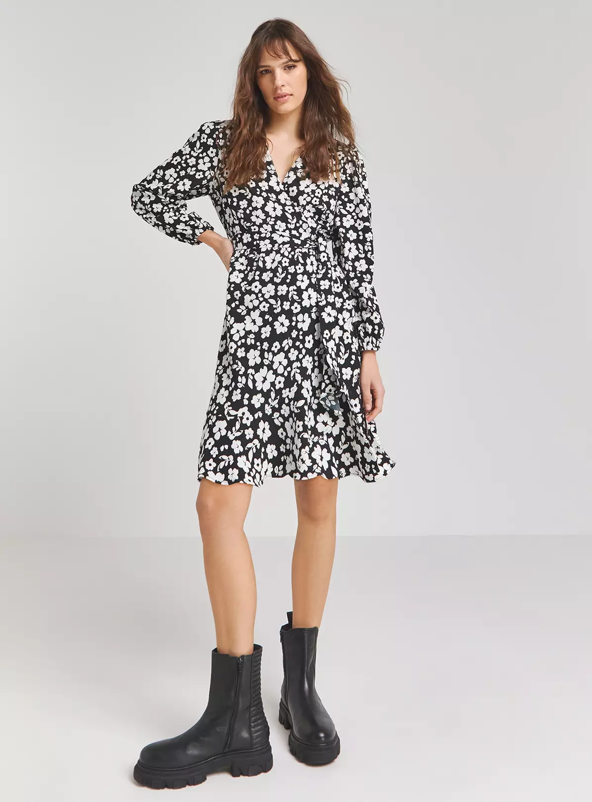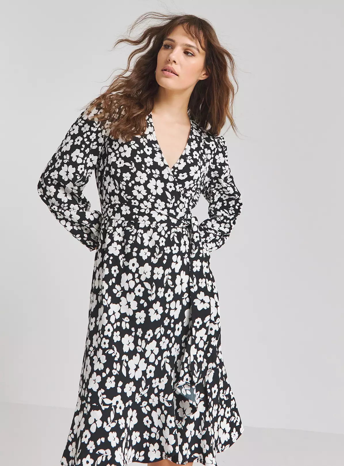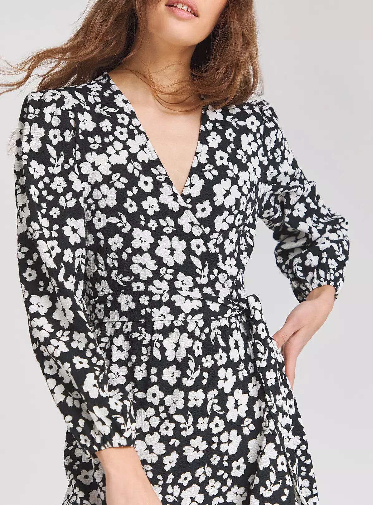 Introducing our Textured Wrap Front Skater Dress – the epitome of versatile, chic style that’s perfect for any occasion. A wrap design, featuring long sleeves and textured fabric, purchase in an on trend mono floral print.