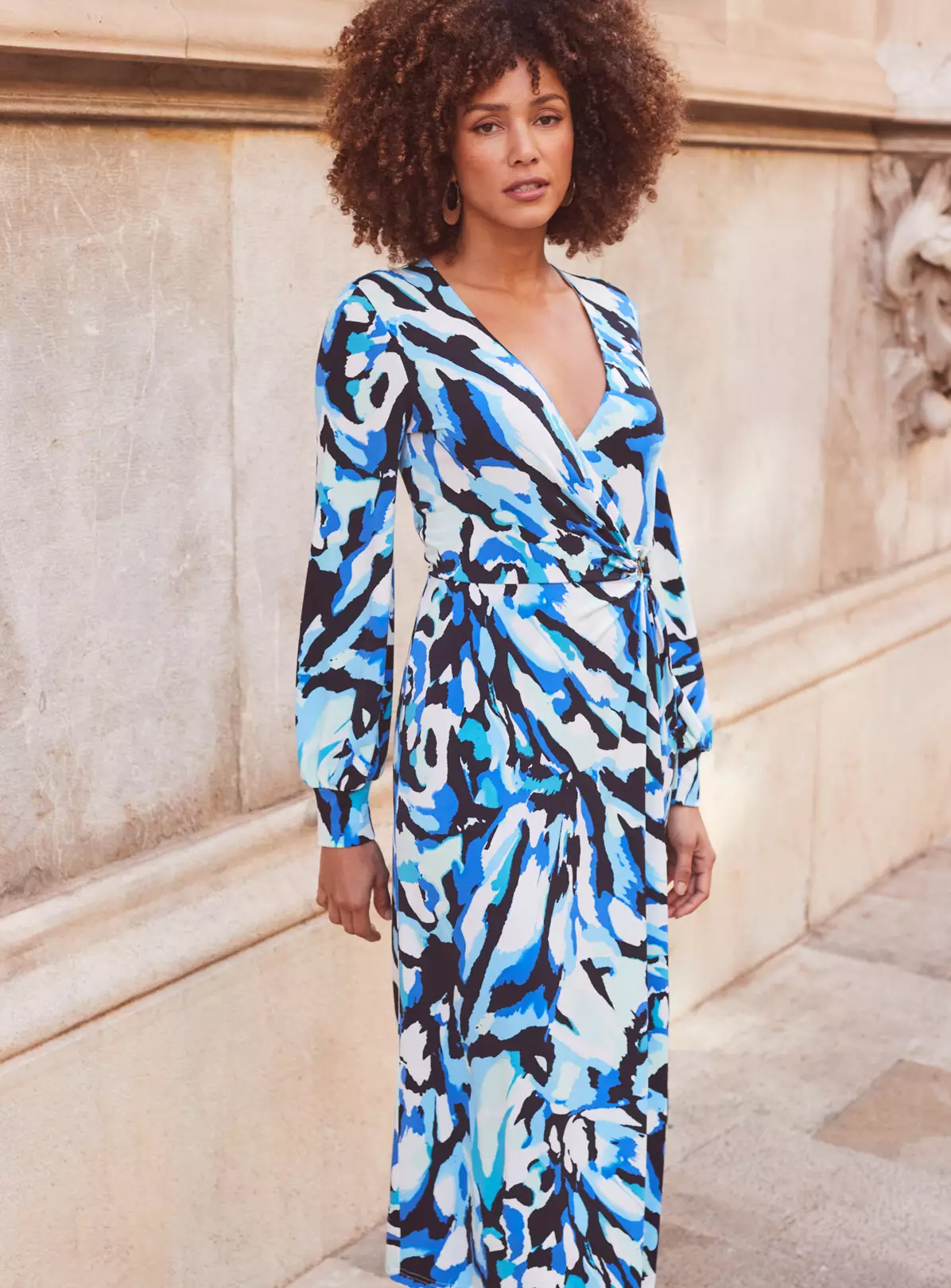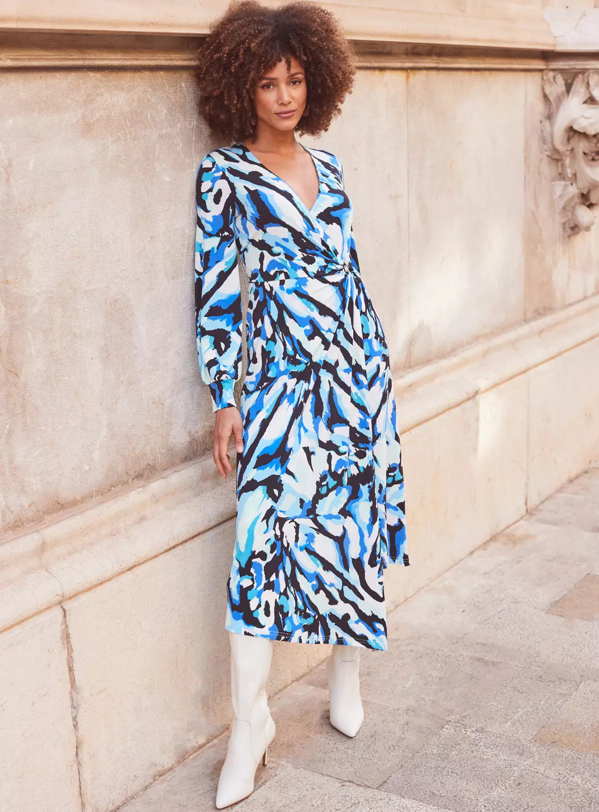 The dress that looks good on everyone, v-neckline suits big and small boobs, waist-cinching gold hardware detail, blouson sleeves create a beautiful silhouette, drapey asymmetric hem, strappies courts knee-high boots – the styling options are endless.