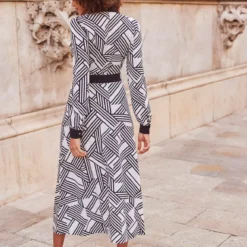 If in doubt shirt dress, monochrome is having a moment, compliments guaranteed geo print, chic contrast trim, you’ll wear it for work and play, it’s made for knee-high or ankle boots.