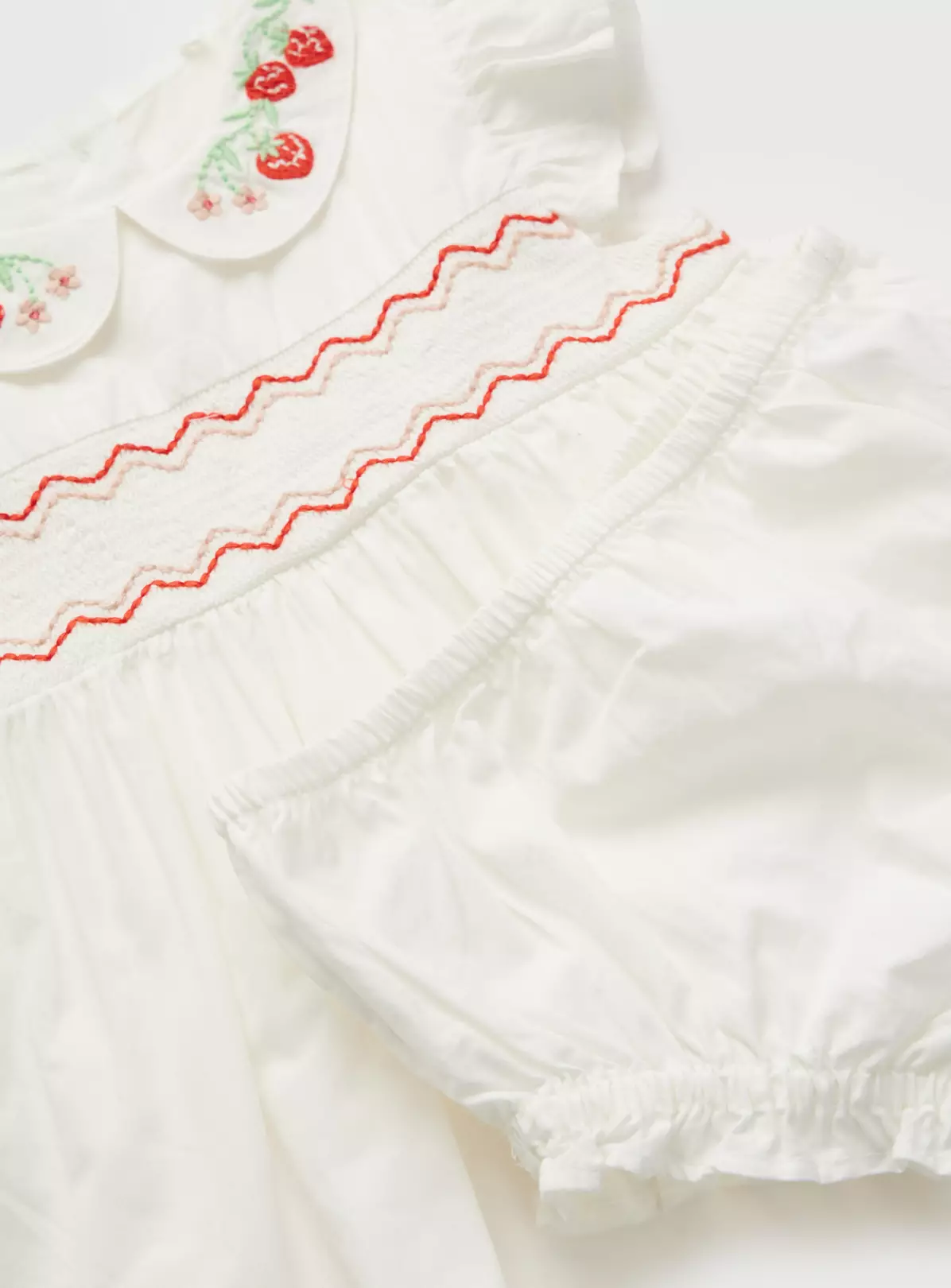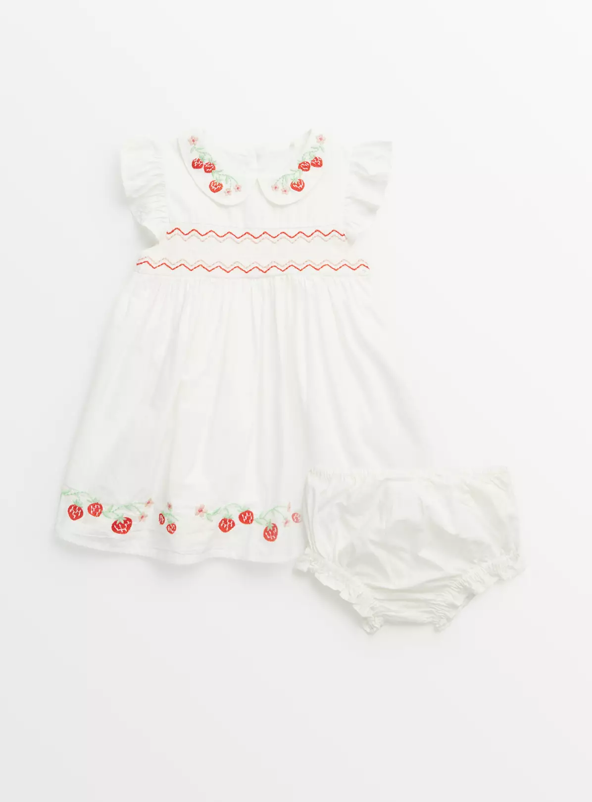Stock up on staple summer outfits for their mini collection with our dress and bloomers set! In a strawberry embroidered design, the dress has frill sleeves and a collar. This set also includes cotton bloomers to pair underneath for a comfortable fit.