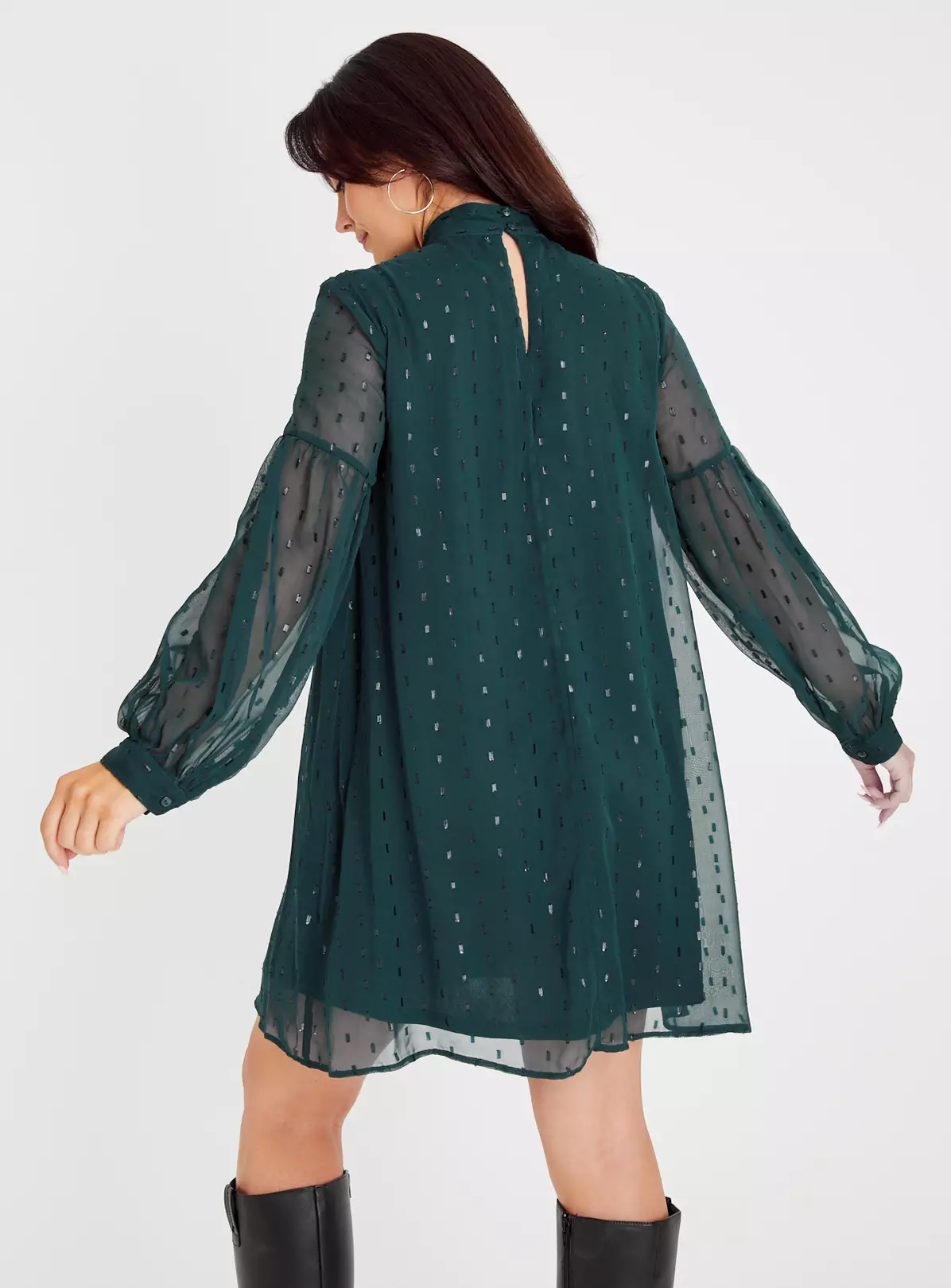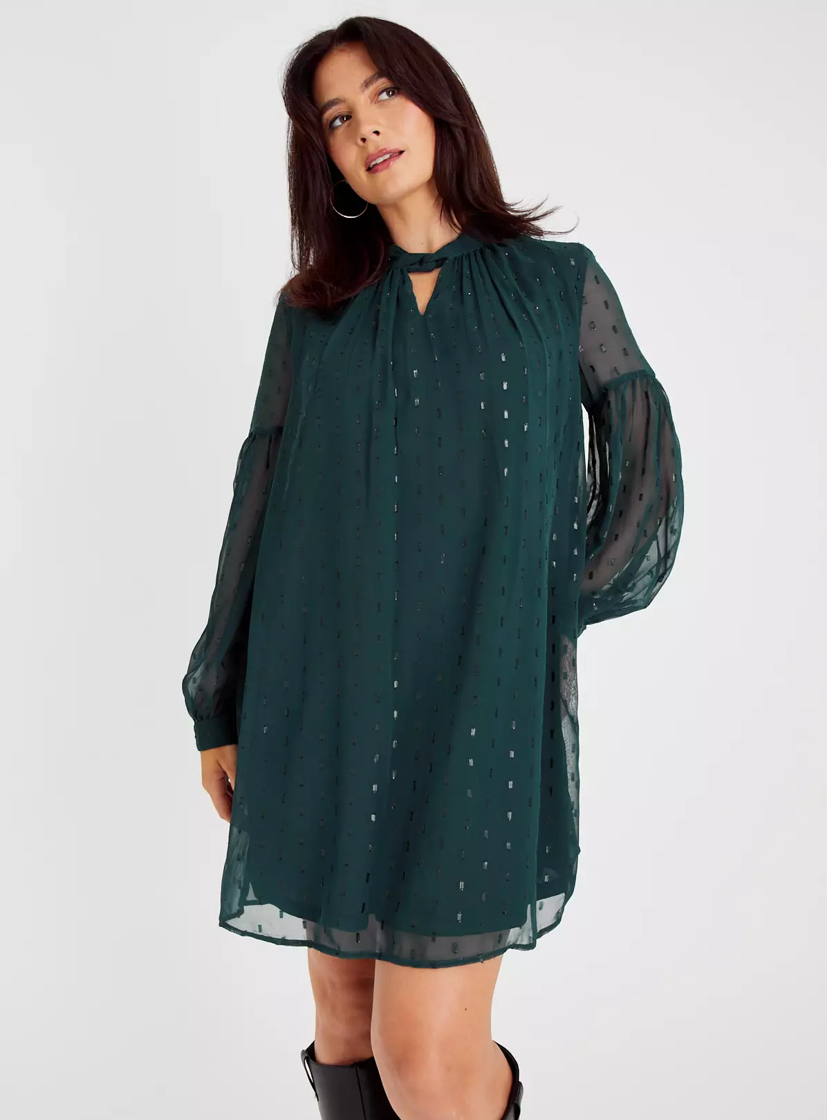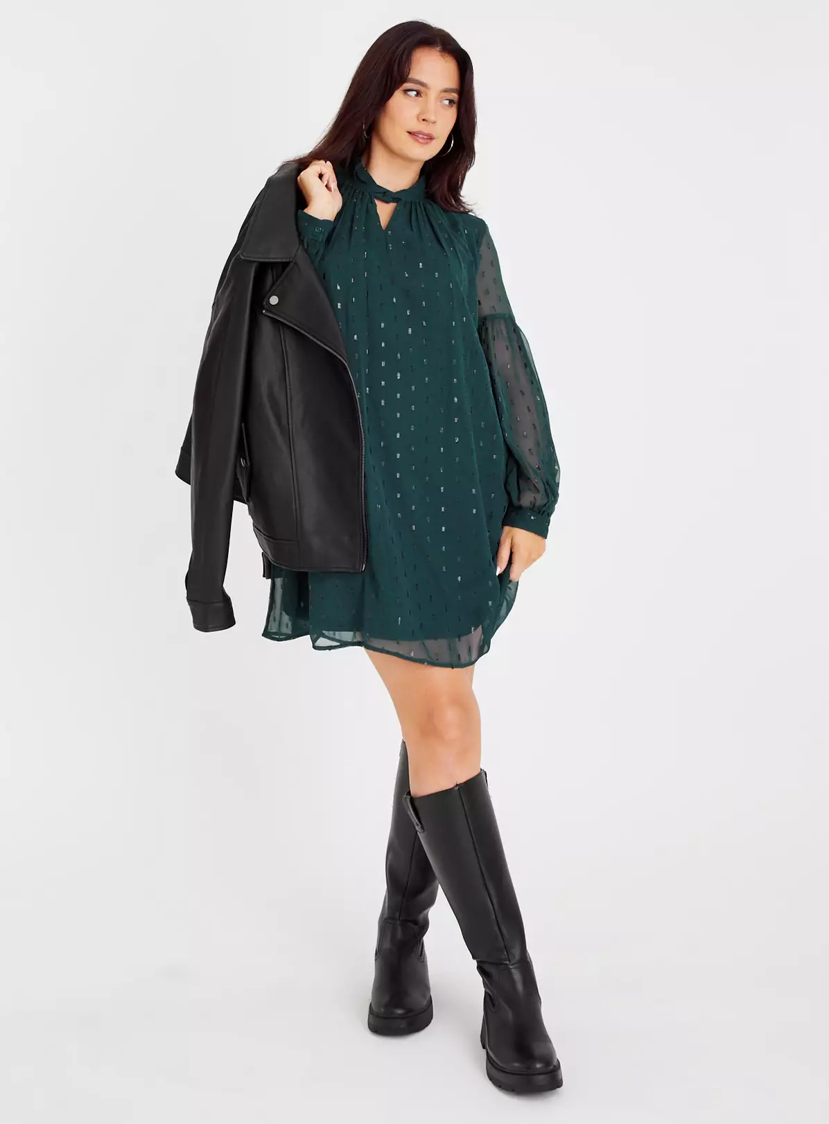 Fresh from our party wear edit, this teal mini dress is perfect for your festive celebrations! It’s elevated by a unique twist neck design and sparkle embellishments. Finish off your look with boots and a clutch.