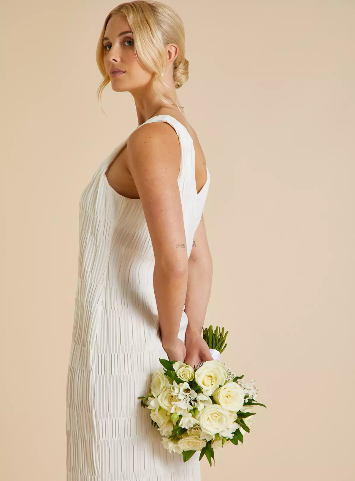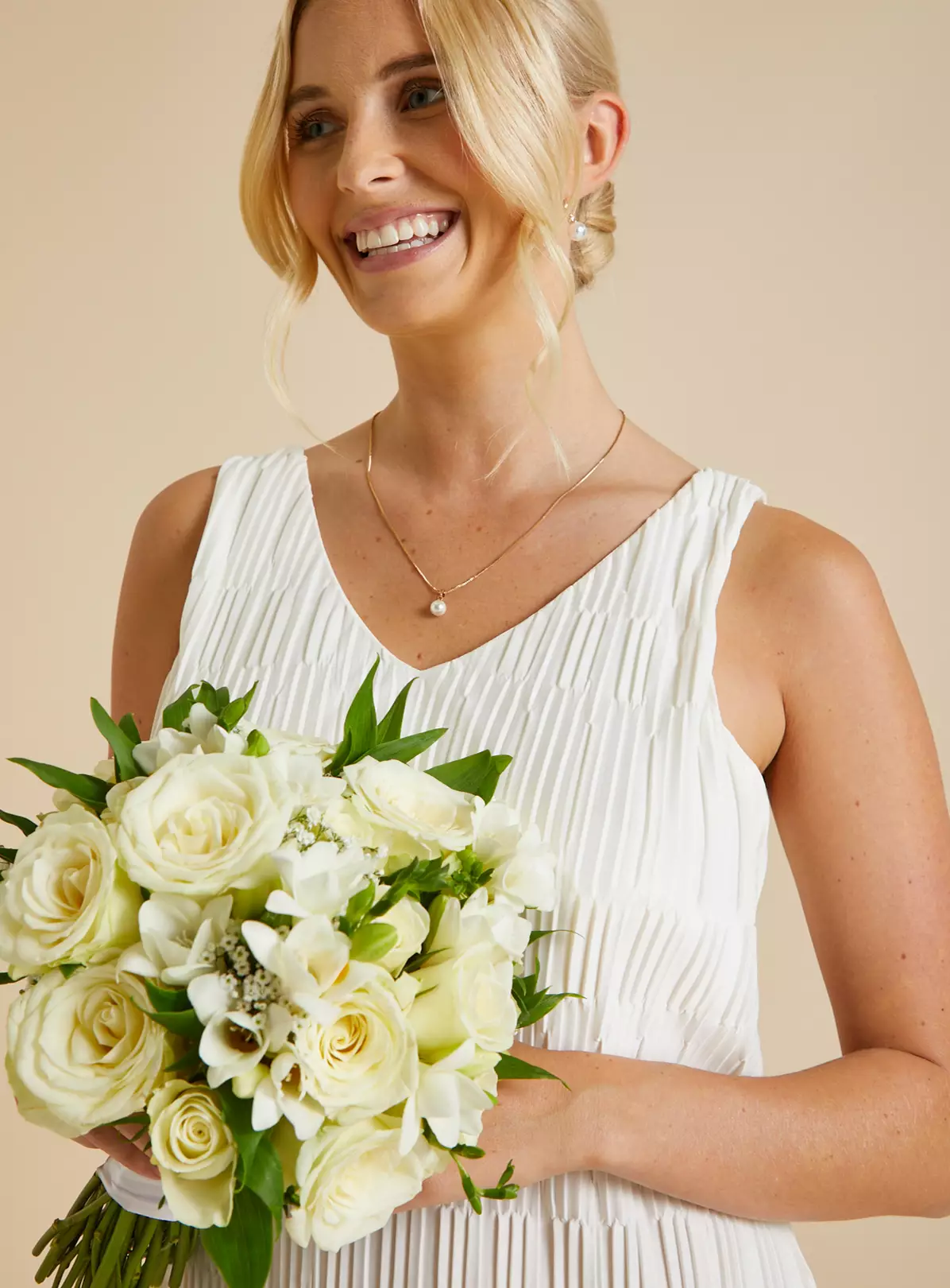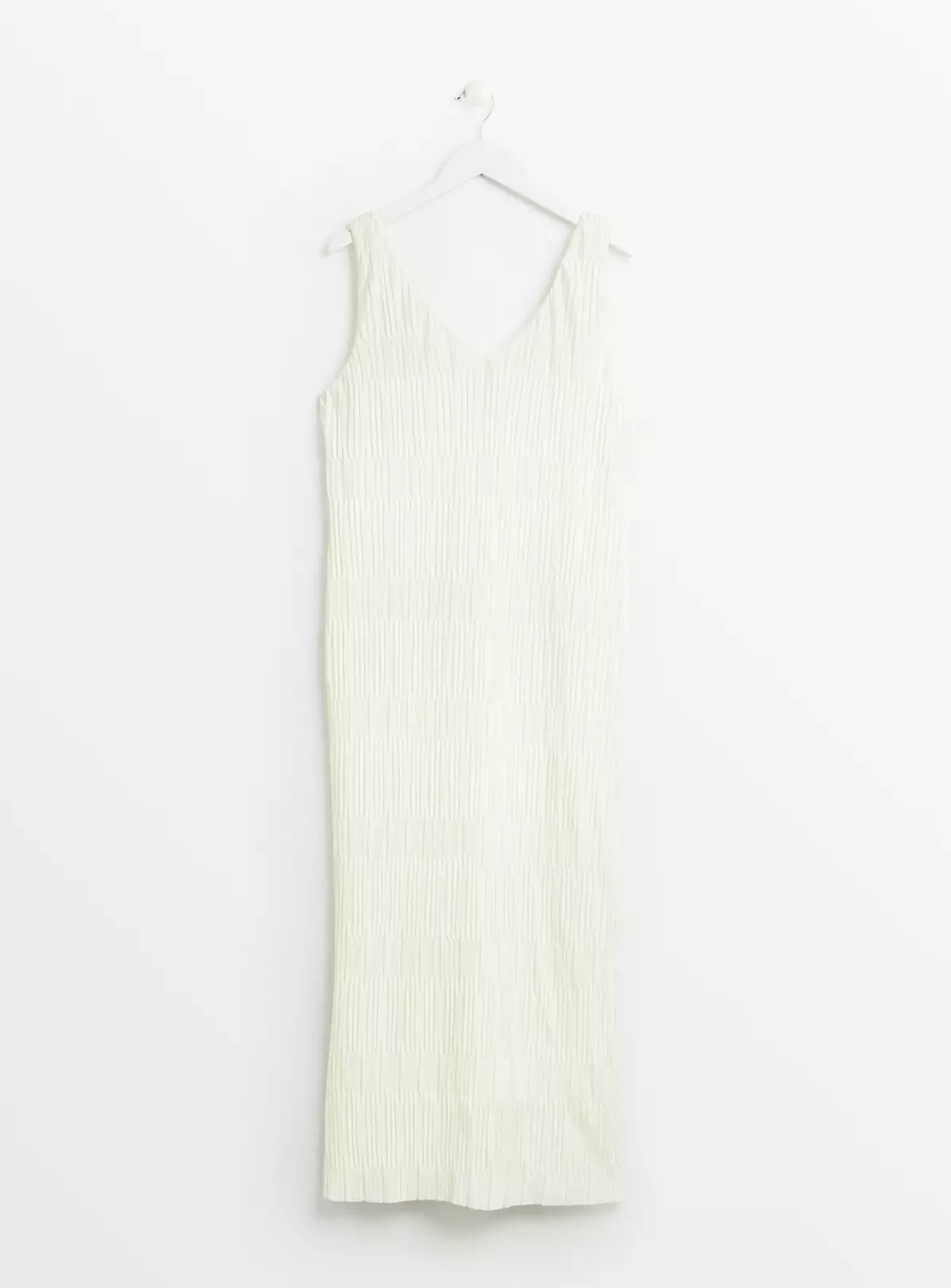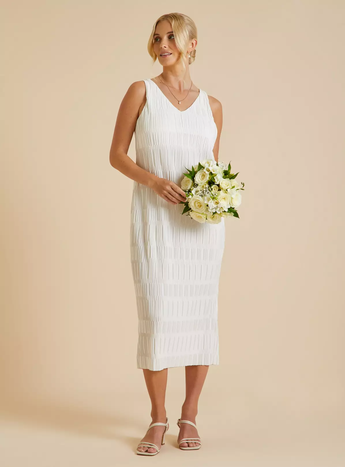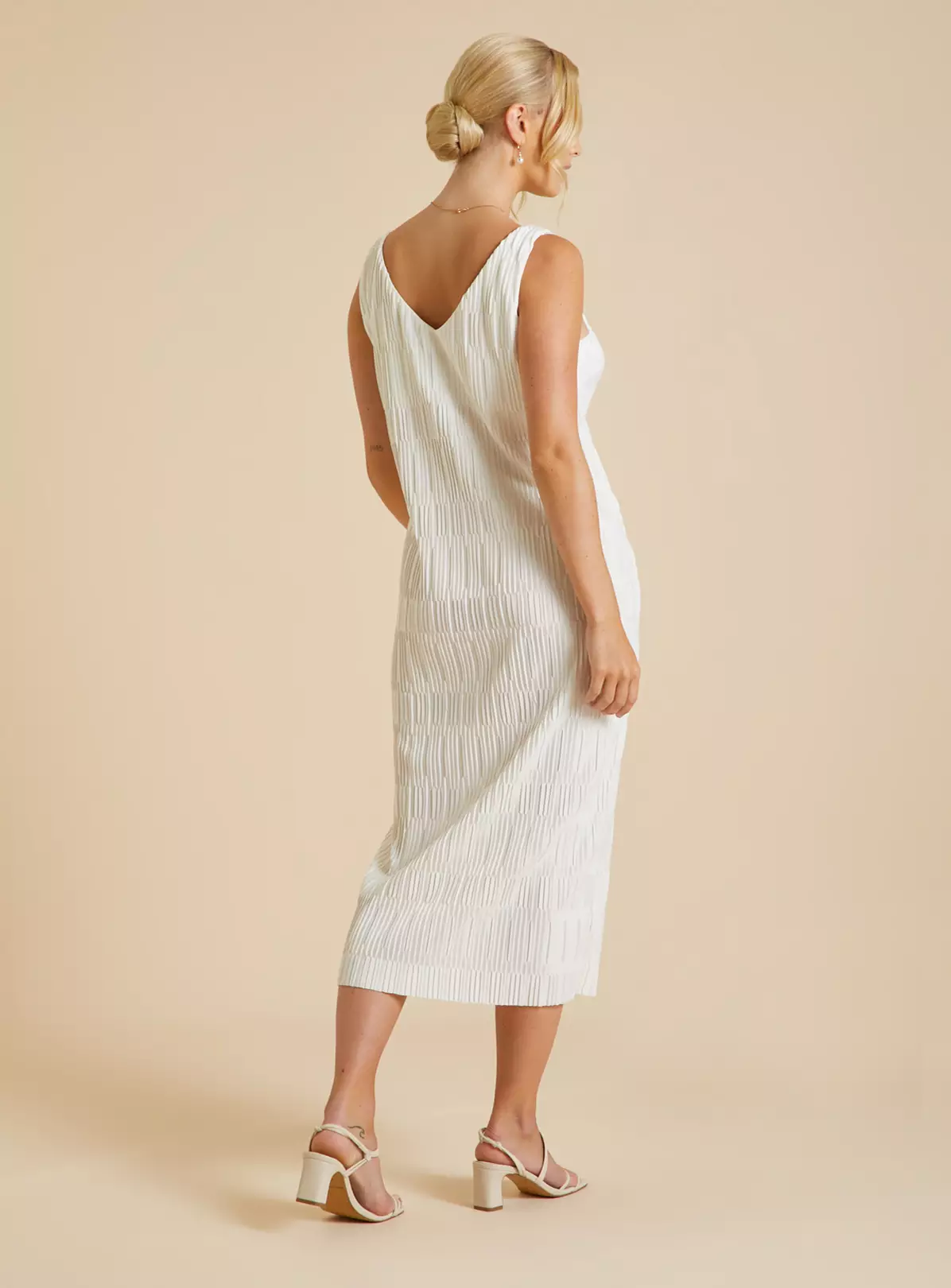 Slip into elegance with our plisse midi dress from our stunning collection. In white, this sleeveless dress features a flattering v-neckline, offering timeless style. Pairing wonderfully with ivory or gold sandals for a graceful look.