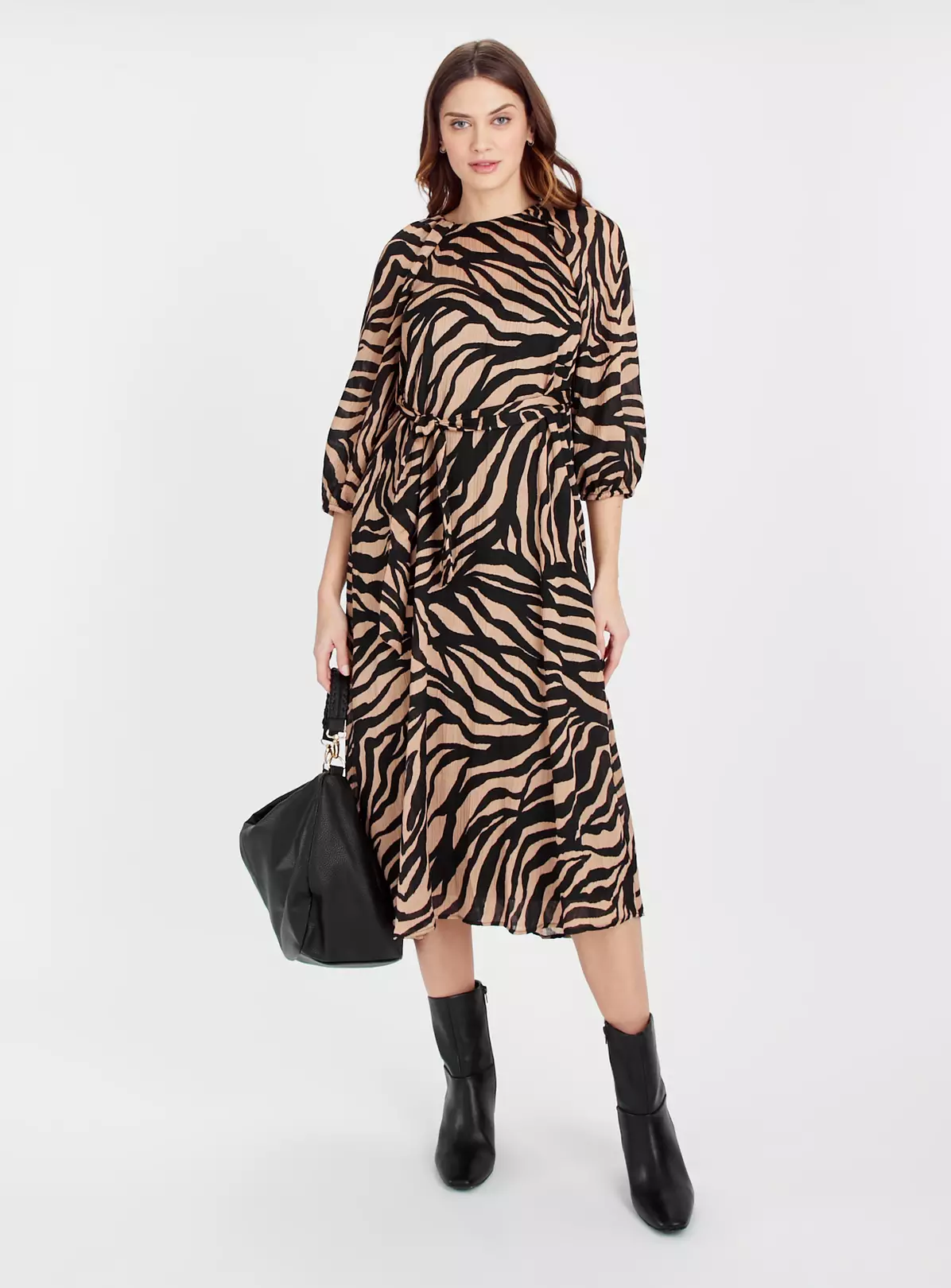 With an all over zebra print, our smock dress will be a welcomed addition to your wardrobe this season. In black and cream it has a crew neckline, balloon sleeves and finished with a under slip dress, just tights and ankle boots!
